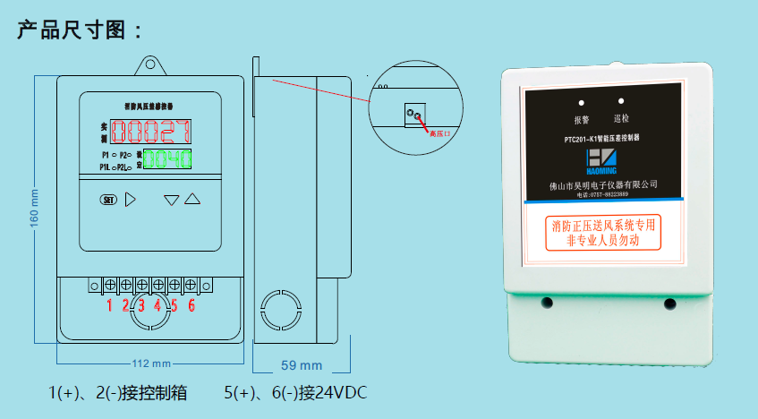 PTC201-K1正壓送風壓力傳感器參數 壓力形式: 表壓,差壓 壓力形式:差壓,壓差 測量范圍:-100~100Pa 工作電壓:24VDC/3A 精 度:1級 耐 壓:1000Pa 動作壓力:前室/走廊動作壓力:30Pa,復位壓力:25Pa 樓梯間/走廊動作壓力:50Pa,復位壓力:40Pa 顯示說明:三位數字顯示實測壓差值 指示說明:綠色巡檢,紅色報警指示燈 輸出方式:無源開關信號,24VDC/3A 過程連接:高壓和低壓孔均為內徑3mm軟管 管嘴連接:(H)高壓端,(L)低壓端 介質溫度:-20~65℃ 待機功率:0.75W 報警功率:1.5W 外形尺寸:86*86*35 重 量:100g