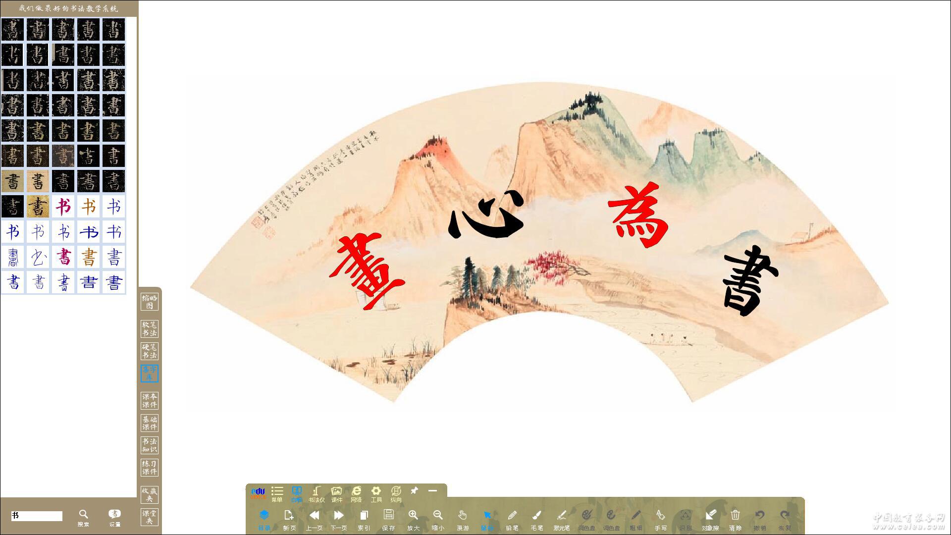 2. 軟筆筆畫教學: 從碑帖單字中一鍵提取任意筆畫,在原帖上進行原帖摹寫、單鉤摹寫、雙鉤摹寫與原字摹寫四種摹寫教學方式以及筆勢講解,任意筆畫都具備在原帖上進行示范動畫。 3. 碑帖單字教學: 提取碑帖字的單鉤、雙鉤及筆畫筆勢進行講解,一鍵顯示單字全部筆畫及筆順,并具有一鍵轉換為原帖摹寫、單鉤摹寫、雙鉤摹寫、原字摹寫四種摹寫教學方式同時配備單字原帖示范動畫及名家書寫雙路示范視頻。 4. 碑帖單字結構教學: ① 可提取碑帖單字中的任意筆畫進行點畫講解,拆分單字進行不同筆畫的輪廓化、填色等結構組合;配合使用內置九宮格、米字格、回米格等書法專用圖形格,教師可進行原字的參照及點畫的布局操作。 ② 點畫關系與字型結構的互動教學。學生可以在電子白板/教學一體機上體會點畫與點畫之間的位置關系;采用不同顏色輪廓化的筆畫,讓學生進行自主搭配組合,加強對字型結構的認知。 5. 章法教學: 筆畫、單字與原帖相互提取:單字到碑帖、單字到筆畫、筆畫到原碑帖、碑帖到單字相互提取。講解筆畫在單字、單字在原帖中的章法關系,及碑帖賞析與講解。 6. 軟筆書體教學: 可一鍵呈現單字在綱要規定的臨摹范本推薦的顏、柳、歐、趙、褚,楷書碑帖字及全息手寫字庫中的全部字例,對碑帖中所有同字的相同點畫進行造型、筆法分析,以及不同結構特征的比對講解,智能書法筆仿真書寫綱要臨摹范本推薦的顏、柳、歐、趙、褚楷書碑帖字,書寫仿真度高。 7. 同字比對教學: 碑帖單字具有“同字比對”功能,可一鍵找到綱要規定的顏、柳、歐、趙、褚臨摹范本中的同一個字的全部字例,針對碑帖中所有同字的相同點畫進行造型、筆法分析,以及不同結構特征的比對講解,讓學生們感受到漢字不同之美。 8. 書寫比對教學: 可一鍵呈現單字在綱要規定的臨摹范本推薦的顏、柳、歐、趙、褚,楷書碑帖字中的全部字例,對碑帖中所有同字的相同點畫進行造型、筆法分析,以及不同結構特征的比對講解,智能書法筆仿真書寫綱要臨摹范本推薦的顏、柳、歐、趙、褚楷書碑帖字,書寫仿真度高。 9. 教師書寫示范: 書法教師在課堂進行書寫示范時,可通過書法教學儀直接在電子白板\觸控一體機上展示教師的書寫技法。 10. 書寫參照互動教學: 任意形式的教學內容都可以一鍵提取到書法儀頁面下作為書寫示范的參照,參照窗口與書寫窗口可進行移動及縮放。 ① 筆畫、單字、碑帖等軟筆教學資源以及硬筆楷書矢量化字庫的任意單字,可直接跳轉到書法儀下進行臨寫示范的參照; ② PPT、Word、視頻、動畫、圖片等教學資源也可直接作為書寫示范的參照; ③ 顯示屏幕上任意位置的教學內容都可一鍵截取到書法儀下進行參照; ④ 作業、掛圖、課本等紙質資源可直接抓取到參照窗口。 11. 書法教學儀16C: 書法教學儀16C具有500萬像素,超A2幅面書寫展示范圍,最高幀率可達30幀/秒。書法教學儀清晰展示書寫過程中毛筆筆鋒的變化與軌跡、運筆和運腕的變化。 12. 智能書法筆: 教師可以在紅外、電磁、電容、電阻、光學、光波、超聲等各種類型電子白板/教學一體機上仿真書寫綱要中臨摹范本推薦的顏、柳、歐、趙、褚楷書碑帖字,書寫仿真度高。 13. 支持漢語偏旁部首教學: 針對大綱的要求和低年級寫字課學習的特點,軟件提供國標編碼標準的8953個漢字的硬筆楷書矢量化字庫與偏旁部首矢量化字庫,方便教師進行低年級硬筆楷書筆畫與偏旁部首教學。 14. 支持硬筆單字講解: 系統提供單字講解、單字注摹、單字臨摹三種單字教學書法模板,教師可選擇不同模板進行各學段的硬筆楷書單字教學。單字講解以硬筆單字為核心,可提取單字筆畫、分解筆畫、并提供了示范動畫供教師使用;單字注摹提供了漢語拼音、筆順提示、提取筆畫、分解筆畫和示范動畫演示;單字臨摹支持進行硬筆單字的臨摹與摹寫教學。 15. 支持硬筆字型結構教學: 可將手寫字庫中所有硬筆單字一鍵提取任意單字筆畫,進行筆畫分解,通過輪廓化、填色等不同方式的組合進行結構講解。 16. 支持硬筆單字搜索與書體教學: 配備GB2312-80與GB12345-1990編碼標準的手寫標準楷書、手寫鋼筆楷書、手寫鋼筆顏楷、手寫鉛筆顏楷、手寫標準細篆、手寫隸書等硬筆全息書法字庫,完全包含國務院公布《通用規范漢字表》的一、二級常用字,可通過搜字庫查字搜索,便于單字的進行不同書體教學。 17. 支持不同年級的詞組 、短文教學: 系統配備了首字注摹、 注音摹寫、注音臨摹三種詞語教學模板,滿足了教師編輯各年級不同類型的語文詞組教學的需求。 首字注摹是指對第一個漢字進行注音、摹寫,可以輸入多個漢字,支持所有單字進行摹寫,書寫框內提示第一個字的注音、筆順、筆劃數等信息,方便了解漢字在詞組中的寫法; 注音摹寫是指對書寫格內所有漢字進行注音,同時支持對漢字進行摹寫; 注音臨摹,顧名思義是指標注漢字的注音,可以對漢字進行臨寫和摹寫。 18. 一鍵關聯成語、常用短語教學 支持將軟硬筆的文本輸入框內任意單字選中,可一鍵顯示單字的所有相關成語、常用短語等,便于教師重點講解單字時根據課程需要隨時引申入有趣的成語、常用短語、俗語知識,增加學生詞匯量。 19. 一鍵簡繁體互換教學 軟硬筆的簡繁體一鍵互換的功能方便教師授課時能方便、正確的講解任意單