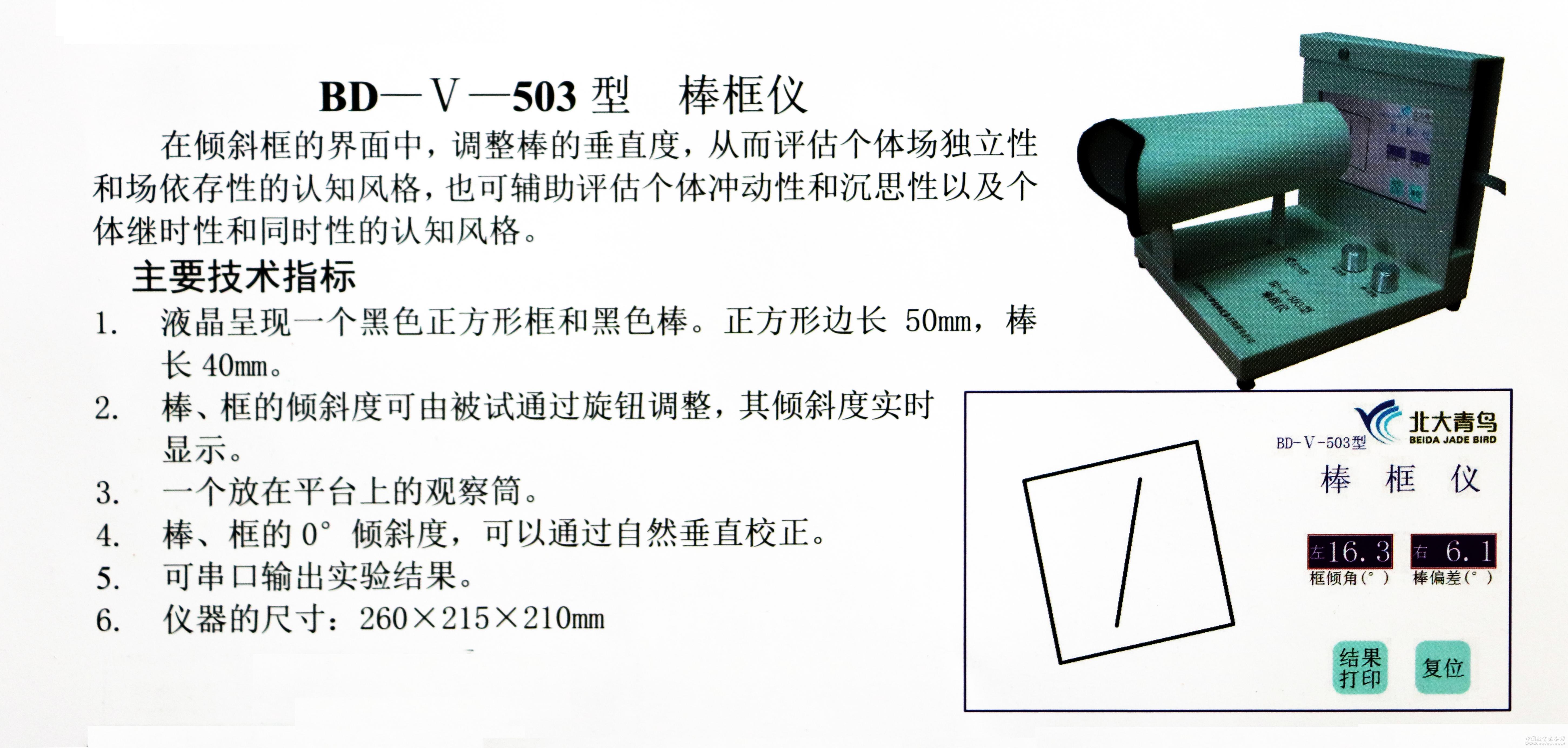 產品詳細介紹在傾斜框的界面中,調整棒的垂直度,從而評估個體獨立性和依存性的認知風格,也可以輔助評估個體沖動性和沉思性以及個體繼時性和同時性的認知風格