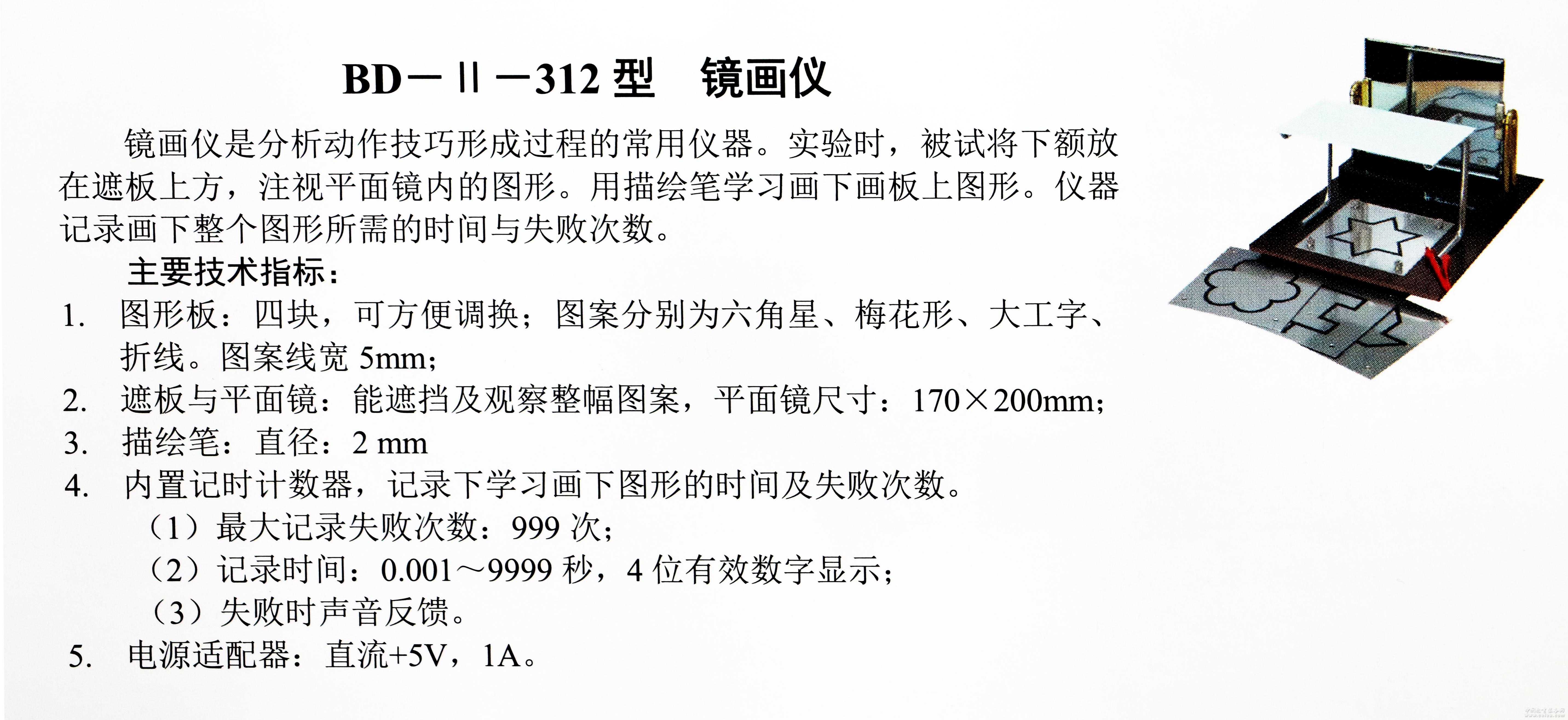 產(chǎn)品詳細(xì)介紹分析動(dòng)作技巧形成的過(guò)程,比較用優(yōu)勢(shì)手學(xué)習(xí)鏡畫(huà)的熟練程度不同時(shí),對(duì)非優(yōu)勢(shì)手的遷移效果。⒈圖形板:圖案為六角星、梅花形、大工字、折線(xiàn)共四塊,可方便調(diào)換;⒉遮板與平面鏡:能遮擋及觀察整副圖案。平面鏡尺寸:170×200mm;帶定時(shí)記時(shí)計(jì)數(shù)器。⒊描繪筆:直徑2mm。 |