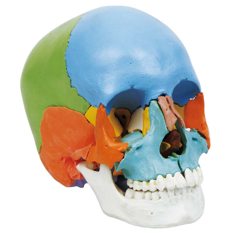 1:1 仿真彩色頭顱模型,多色區分各顱骨塊,可拆分、下頜活動、帶完整牙齒。清晰展示額骨、頂骨、顳骨、蝶骨、枕骨等結構,醫學教學、藝術參考、科普展示通用,顏色鮮明、結構精準。