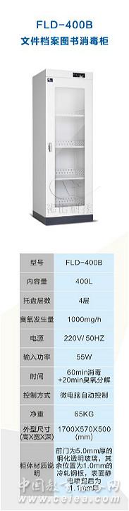 產品詳細介紹FLD-400B檔案圖書消毒柜 檔案、圖書消毒柜是一種用于檔案文件、圖書資料滅菌的專用設備。它采用微電腦自動控制技術,能殺滅沾染在檔案文件、圖書資料的大腸桿菌、金黃色葡萄球菌、肝炎病菌、霉菌及各種害蟲,用戶根據(jù)檔案圖書等受污染程度,可選擇不同的的控制時間,進行滅菌殺蟲,本產品具有殺蟲消毒效率高、無死角、無污染、壽命長等特點,適用于檔案、圖書、文件、信件等不可高溫消毒物品的表面消毒。 產品特點: ⊙柜體表面采用防靜電噴塑處理,安全,美觀。 ⊙顯示屏為彩屏,美觀大方。 ⊙帶溫濕度顯示。 ⊙臭氧組件采用集成模塊臭氧發(fā)生器,使用壽命超過8000小時。 ⊙微電腦控制,智能啟動,自動消毒,操作簡單。 ⊙托盤要求正面為平板結構,以方便取放書籍及資料等。 ⊙根據(jù)消毒書籍的滿載量,可以自行設定消毒時間,一般為10-60分鐘可調,消毒時間設置按5分鐘/次跳動。 ⊙消毒滅菌無死角,消毒效率高,濃度穩(wěn)定在滿足消毒要求的最小濃度內。分解后,無二次污染。 ⊙通過國家專利認證、歐盟CE認證 ⊙通過ISO9001質量管理體系認證。 相關參數(shù): 型號 FLD-400A FLD-400B 內容量 400L 托盤層數(shù) 4層 臭氧發(fā)生量 1000mg/h 電源 220V/50HZ 輸入功率 55W 時間 30-60min消毒+20min臭氧分解 顯示方式 智能數(shù)碼顯示 控制方式 微電腦自動控制 凈重 65KG 外型尺寸(高*寬*深) 1700X570X500(mm) 柜體材質說明 A:柜體采用1.0mm冷軋鋼板,全鋼結構。 B:柜體采用1.0mm冷軋鋼板,前門為5.00mm透明鋼化玻璃