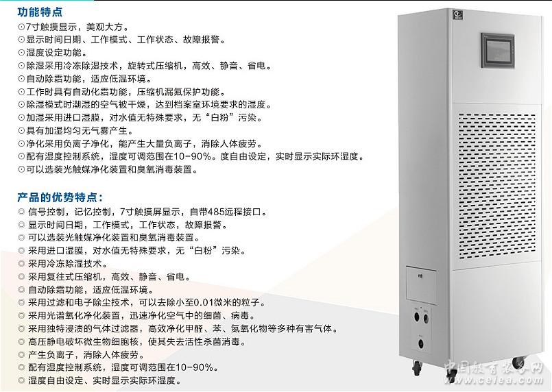 產品詳細介紹加濕除濕凈化消毒一體機 功能特點 7寸觸摸顯示,自帶485遠程接口,更加美觀大方。 顯示時間日期、工作模式、工作狀態、故障報警。 濕度設定功能。 除濕采用冷凍除濕技術,旋轉式壓縮機,高效、靜音、省電。 自動除霜功能,適應低溫環境。 工作時具有自動化霜功能,壓縮機漏氟保護功能。 除濕模式時潮濕的空氣被干燥,達到檔案室環境要求的濕度。 加濕采用進口濕膜,對水值無特殊要求,無“白粉”污染。 具有加濕均勻無氣霧產生。 凈化采用負離子凈化,能產生大量負離子,消除人體疲勞。 配有濕度控制系統,濕度可調范圍在10-90%。濕度自由設定,實時顯示實際環濕度。 可以選裝光觸媒凈化裝置和臭氧消毒裝置。