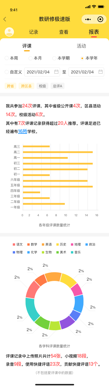 界首中學是2年前開始,教務(wù)處運用愛評課服務(wù)授課和講課老師進行常態(tài)化的教研活動。從最開始十個班試點到現(xiàn)在全校108個班級的常態(tài)課例分析,愛評課助力8個學科各學習單元第一講后的研討分析修正,提高老師們在第二講和以后的講授環(huán)節(jié)的互動、時間把控、問題的設(shè)計、自主學習與小組合作的組織等教學環(huán)節(jié)的科學、有效,整體提升教學質(zhì)量。