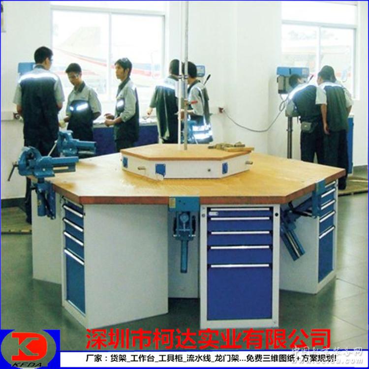 柯達KD-g05六角鉗工臺-電氣島: 1-臺面中間設置電源氣源接口臺,配備單相220V,三相380V電源插座和氣源接口(各六個)。臺面中間配小臺面每邊邊長550mm; 2-用途:主要用于安裝電氣接頭、氣源接頭、開關等電器群。