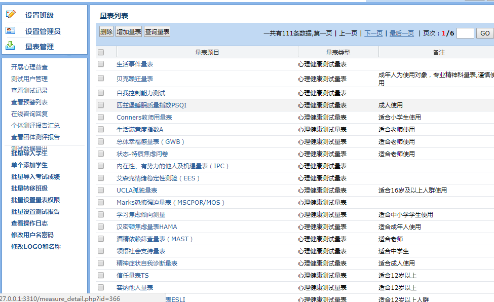 產(chǎn)品詳細(xì)介紹擁有110個最新修訂量表量表,包含最權(quán)威的scl90等 軟件完全按照學(xué)校日常的分級管理而設(shè)計,主要分為校級管理員(分管心理健康教育的校長、心理輔導(dǎo)老師等)、班級管理員(班主任、輔導(dǎo)老師、學(xué)科老師等)和測評人員(學(xué)生或老師或家長)三個登陸端口。 校級管理員可以直接管理全校學(xué)生,班級管理員只能看到本班學(xué)生情況。(教育部明確指出心理健康教育的主力軍是班主任,所以班主任通過該系統(tǒng)了解每個學(xué)生的情況是非常有必要的。) 軟件還擁有:心理普查、測試用戶管理、查看測試記錄、查看預(yù)警列表、在線咨詢、個體測評報告匯總、查看團(tuán)體測評報告、測試數(shù)據(jù)導(dǎo)出、批量導(dǎo)入學(xué)生、單個添加學(xué)生、批量導(dǎo)入考試成績、批量轉(zhuǎn)移班級、批量設(shè)置量表權(quán)限、批量設(shè)置測試報告、修改LOGO和名稱等功能,大大降低了心理老師的工作時間,提高了工作效率與管理質(zhì)量。 |