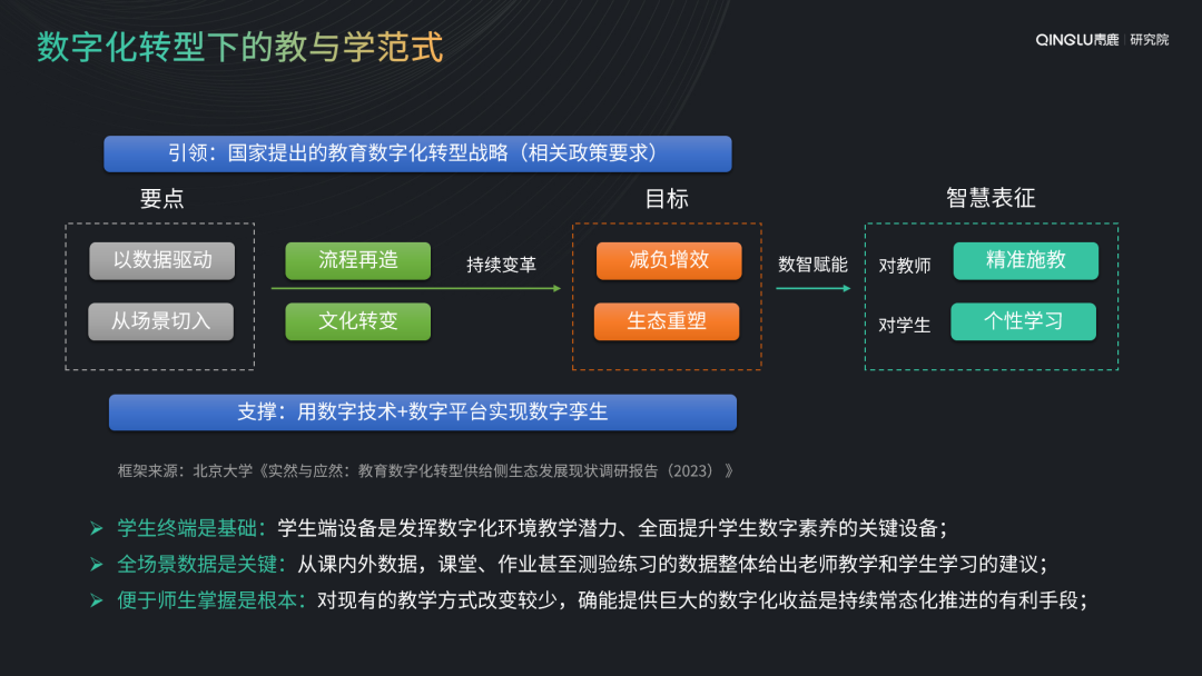 青鹿廖院長引用北京大學(xué)《實然與應(yīng)然:教育數(shù)字化轉(zhuǎn)型供給側(cè)生態(tài)發(fā)展現(xiàn)狀調(diào)研報告(2023)》的理論框架,提出了對數(shù)字化轉(zhuǎn)型下教與學(xué)范式的新思考,并展開了青鹿基于智能學(xué)生終端的數(shù)字化教學(xué)實踐的分享。