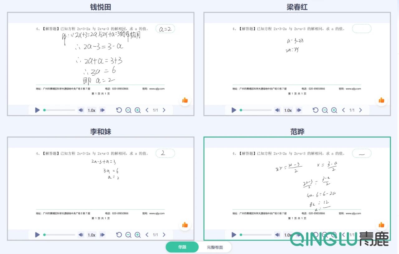 在學(xué)生使用青鹿智能筆完成課堂、課外的測練后,系統(tǒng)自動批改作答結(jié)果,教師可以在課堂上通過教學(xué)一體機對測練情況進(jìn)行展示,并利用畫筆進(jìn)行批注和講評。同時,教師還可以使用智能筆在學(xué)生紙質(zhì)測練上進(jìn)行書寫講評,教學(xué)一體機大屏將實時同步顯示題目和筆跡。