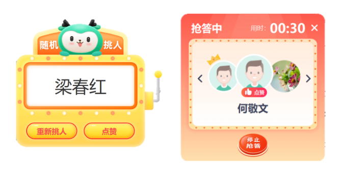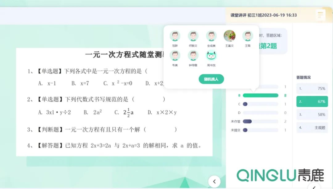 “一言堂”是傳統(tǒng)課堂教學中常見的一種現象,教師講、學生聽,師生缺乏互動,學生自主思考空間少,難以做到當今所提倡的“以學生為中心”的教學。而通過青鹿智慧紙筆互動課堂的隨機挑人、搶答功能,既能提高師生互動率,又能激發(fā)學生課堂興趣,是教師快速“入門”智慧課堂的好幫手。