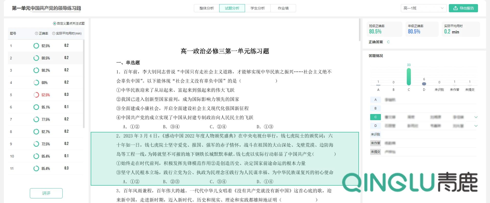 在黃晶穎老師帶來的道德與法治課《人教版必修3第一單元復習課》上,黃老師提前一天下發(fā)課外練習作業(yè)的形式,讓同學們進行單元小測,老師通過單元小測的測試結果進行針對性備課,讓課堂教學更精準。