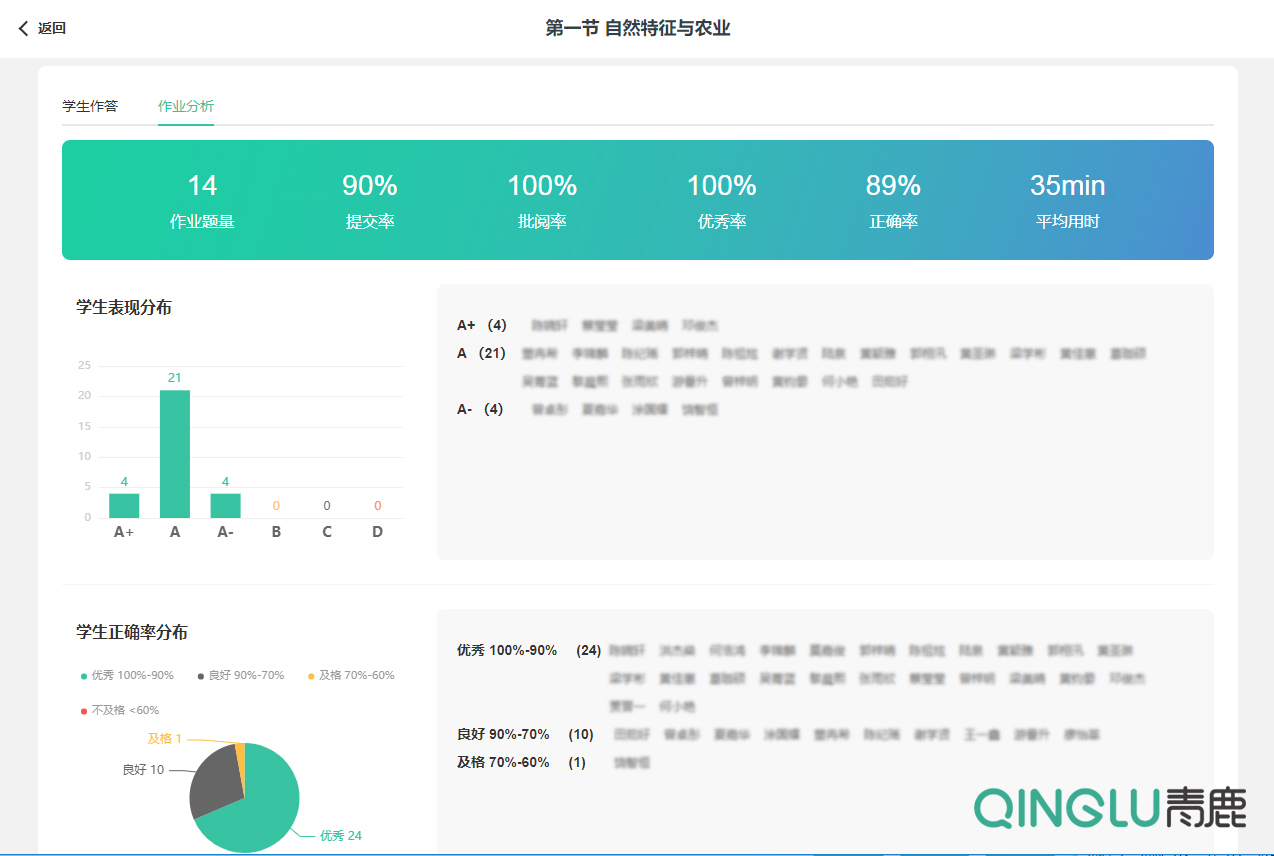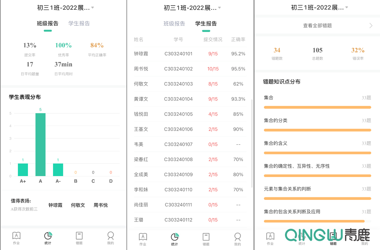 青鹿智慧作業能夠自動生成多維度的作業數據分析報告,精準反饋面向學生個體、班級、年級、學科等不同層次的典型作業特征,為教師打造高質量“課前—課中—課后”教學閉環提供數據決策支持。