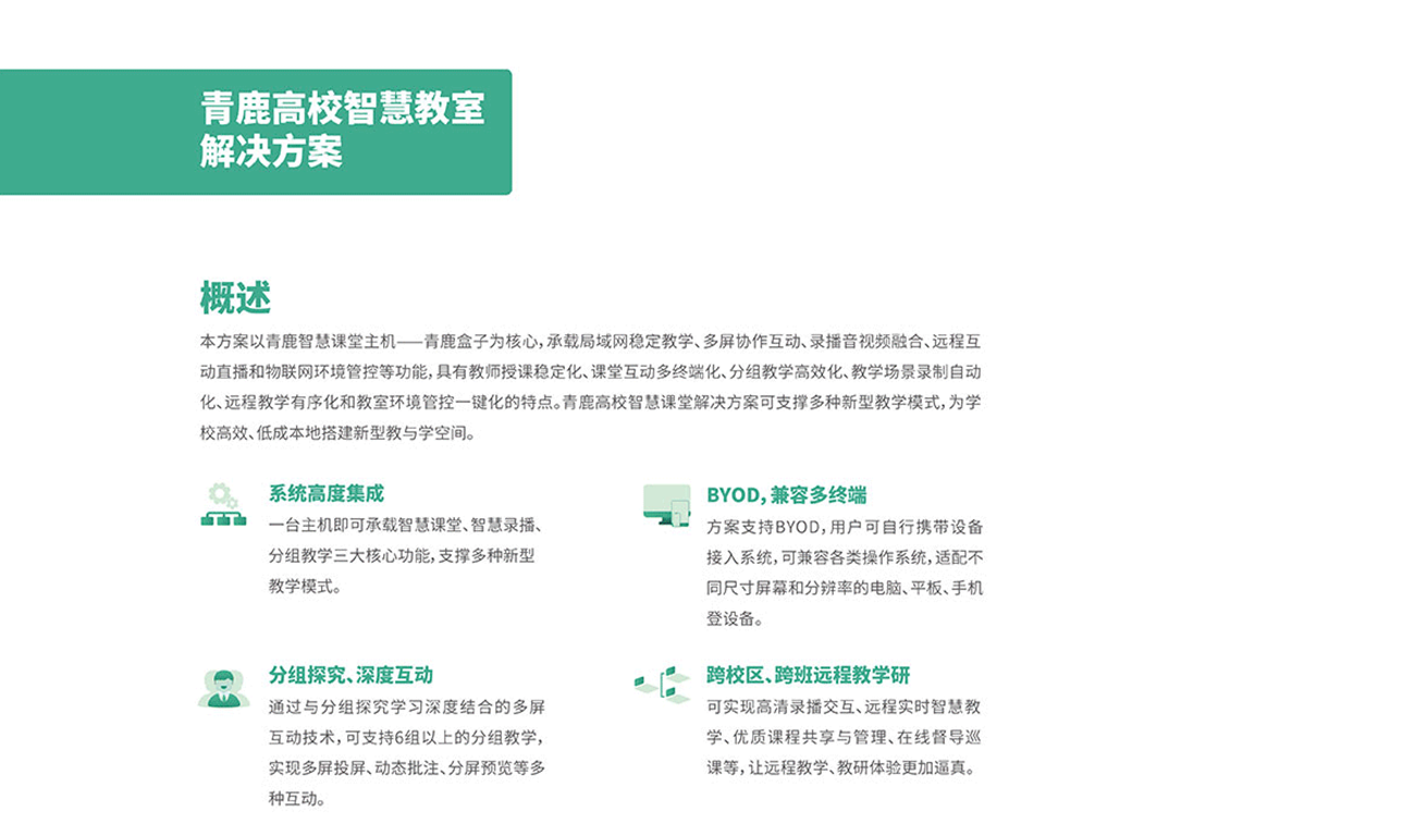 | 智慧教育信息化整體解決方案提供商,我們提供集智慧紙筆課堂、智慧錄播為一體的智慧教學環(huán)境,提供一套可廣泛應用于K12學校信息化整體建設的開放式底層平臺,為學校的教學和管理質量提升提供支撐,賦能教育的數(shù)字化轉型。 |