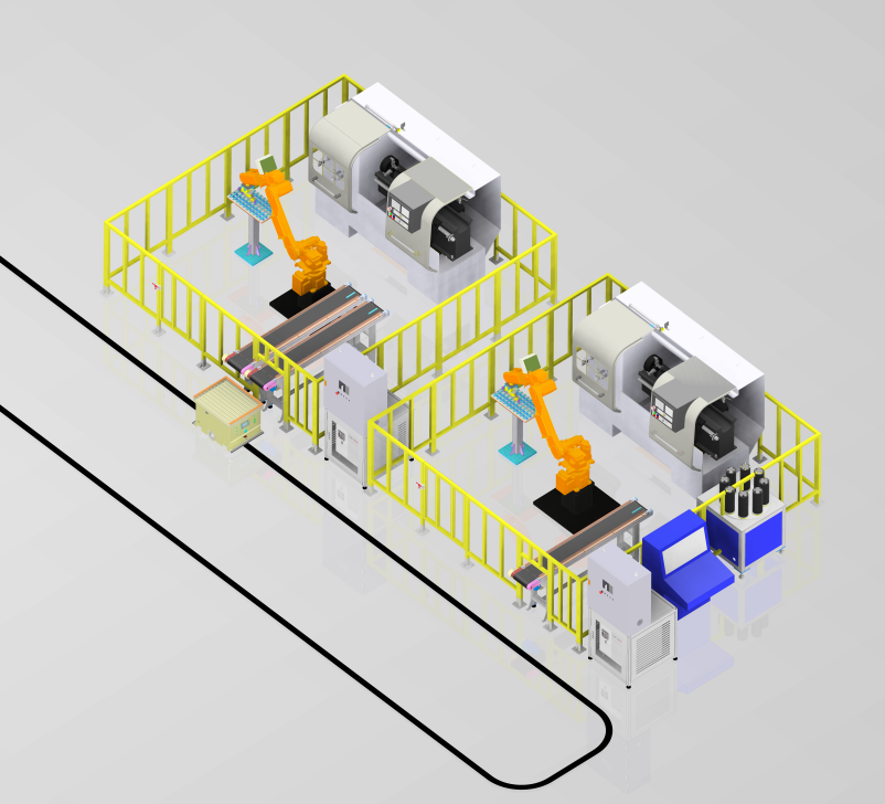 本設備包含機器人本體、自動上料裝置、下料輸送裝置、車床改造一臺。人工將毛坯件放入到上料機自動上料,機器人從上料機上取料,對兩臺機床進行自動上下料工作,車床自動關門加工,加工完成由機械手將成品取出,放置到皮帶線上進行輸送。