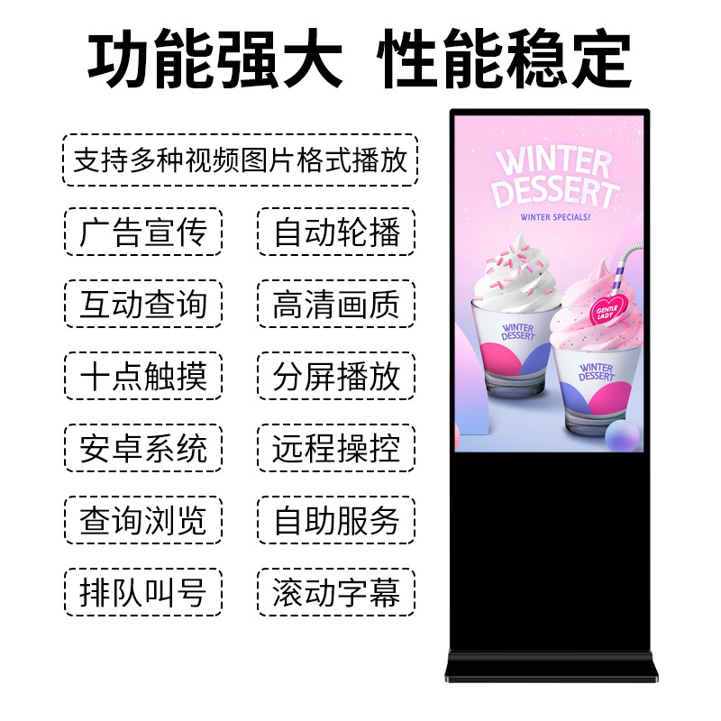 產(chǎn)品詳細(xì)介紹1)超薄機(jī)身4.5cm, 3cm超窄邊框,鋁合金烤漆工藝。正面采用4mm的鋼化玻璃,防刮,防爆 2)無(wú)按鍵設(shè)計(jì),結(jié)合機(jī)身散熱部位,設(shè)計(jì)密集多網(wǎng)孔,散熱降溫效果好!網(wǎng)孔內(nèi)設(shè)置了防塵網(wǎng),達(dá)到很好的防塵效果 3)LG液晶屏,高清顯示,色彩亮麗,畫質(zhì)清晰 4)安卓版跟網(wǎng)絡(luò)版兩種主板可供選擇 5)一線大牌的觸控技術(shù),反應(yīng)靈敏,無(wú)斷點(diǎn),穩(wěn)定性強(qiáng) 6)采用最新的LED顯像技術(shù),功耗低至100W,節(jié)能環(huán)保,經(jīng)濟(jì)實(shí)惠 7)質(zhì)保一年,全國(guó)聯(lián)保,終生免費(fèi)提供售后及技術(shù)支持