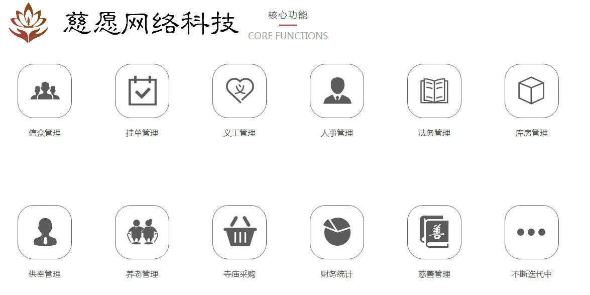 系統功能:信眾管理,法務流通處,法事法會,捐贈,放生,皈依,義工,常住掛單,會員,財務,庫房,點燈,檔案管理,財務報表、在線采購等等。