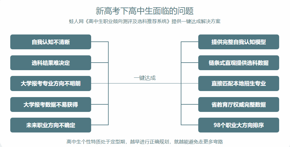產品詳細介紹《高中生職業傾向測評及選科推薦系統》全國首創,配合山東省教育廳獨立研發。引進國外先進理論進一步融合,測評工具更科學。獲山東省教育廳及多所高中名校首肯與推薦。著眼于學生的個性,客觀理性幫住學生選擇適合科目。自2018年正式面市以來,由省內外55萬高中生親測,近500所高中學校實際檢驗,蛙人網進入40多所高中學校全方位指導,面向省內外各市教育局開展系統培訓說明會達20余次。 《慧眼識鷹》課程延伸: 蛙人網開放與有意向的學校、老師和社會教育機構及人員合作,以《慧眼識鷹》作為基礎工具,進行個性化教學系統的研發,旨在通過個性 化的教育讓學生輕松快樂應對學習,同時普遍提高學習成績。 《慧眼識鷹》貫穿企業、學校、家庭,主講佟翔天老師擁有多年企業指導經驗,可快速讓學員達成更深度的社會認知。并且蛙人網可根據學 員需求,牽線邀請眾多領域職業專家,為學員解讀各職業所需技能、特質、狀態等,直擊社會各類職業真實狀態,彌補部分老師、家長在指 導學生選科及職業生涯規劃中的經驗不足。為教師和家長提供一整套完善的日常管理和指導提升學生的工具。 有意向者可聯系:4000600062 |