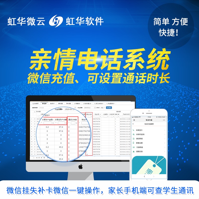 產(chǎn)品詳細(xì)介紹 1、話費(fèi)套餐微信充值:可以直接微信充值電話費(fèi); 2、設(shè)定親情號(hào)碼:每張可捆綁4個(gè)親情號(hào)碼,親情號(hào)碼家長自己可以在微信端自己增刪減改 3、查詢通話記錄:家長和學(xué)校可以分別在手機(jī)微信端和系統(tǒng)后臺(tái)查看學(xué)生的通話詳情 4、設(shè)定單次通話時(shí)長:可設(shè)定單次通話時(shí)長,對學(xué)生通話號(hào)碼進(jìn)行管控,防止非事務(wù)性閑聊 5、計(jì)費(fèi)規(guī)則:自定義通話計(jì)費(fèi)規(guī)則 系統(tǒng)不采用寫卡方式,可使用普通的IC卡,卡片丟失后可通過微信移動(dòng)端直接完成掛失,到管理處補(bǔ)辦一張即可;家長通過關(guān)注學(xué)生信息的方式可及時(shí)了解學(xué)生卡內(nèi)的通話費(fèi)用余額,及時(shí)充值,秒到賬,也可以通過微信直接辦理電話套餐等,所有信息家長均可通過微信及時(shí)掌握,簡單!方便!快捷! |