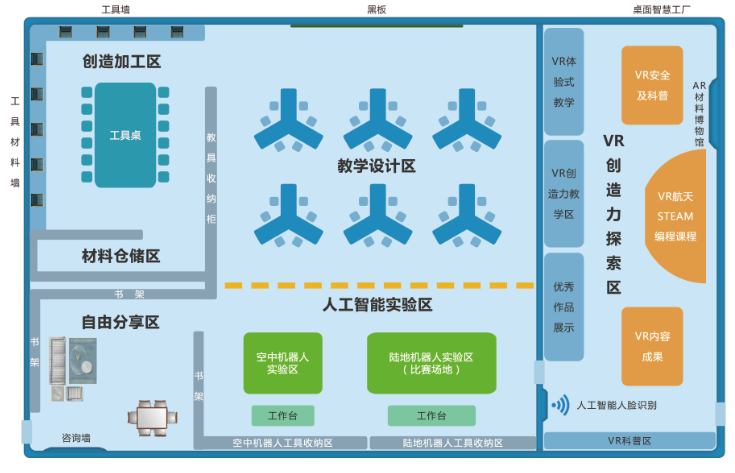 產品詳細介紹創客空間根據學校需求,在物理分布上將空間劃分為教學設計區、創造加工模塊、VR科普及創新力探索區、材料倉儲區以及選配置的自由分享區、人工智能實踐區、成果展示區6大板塊。提供四大資源支持,包括教材手冊資源、配套設備與工具、導師資源、大賽輔導資源。實現“科普創新、多元實踐、決勝創賽”。