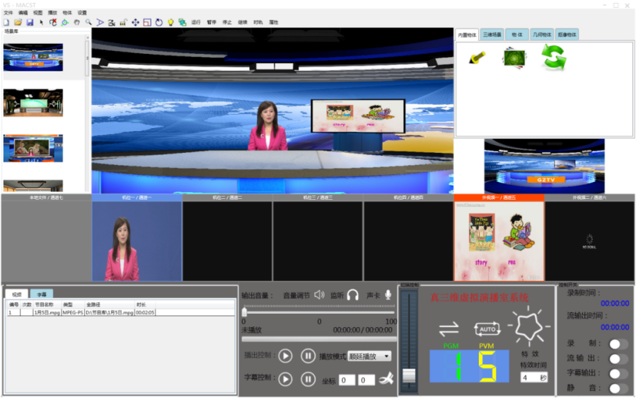5)導(dǎo)播 導(dǎo)播模式:手動(dòng)/半自動(dòng)/自動(dòng)模式。 支持多種自定義特效。 支持任意虛擬機(jī)位之間的特效切換功能。 支持虛擬機(jī)位和外視頻、本地媒體播放之間的特效切換功能; 外視頻及本地媒體播放,即支持任意多路虛擬大屏幕,同時(shí)也支持通道之間特效切換。 支持JPG、PNG格式臺(tái)標(biāo)。 支持圖片字幕和文本字幕疊加。 支持外接專用虛擬搖臂導(dǎo)播鍵盤。