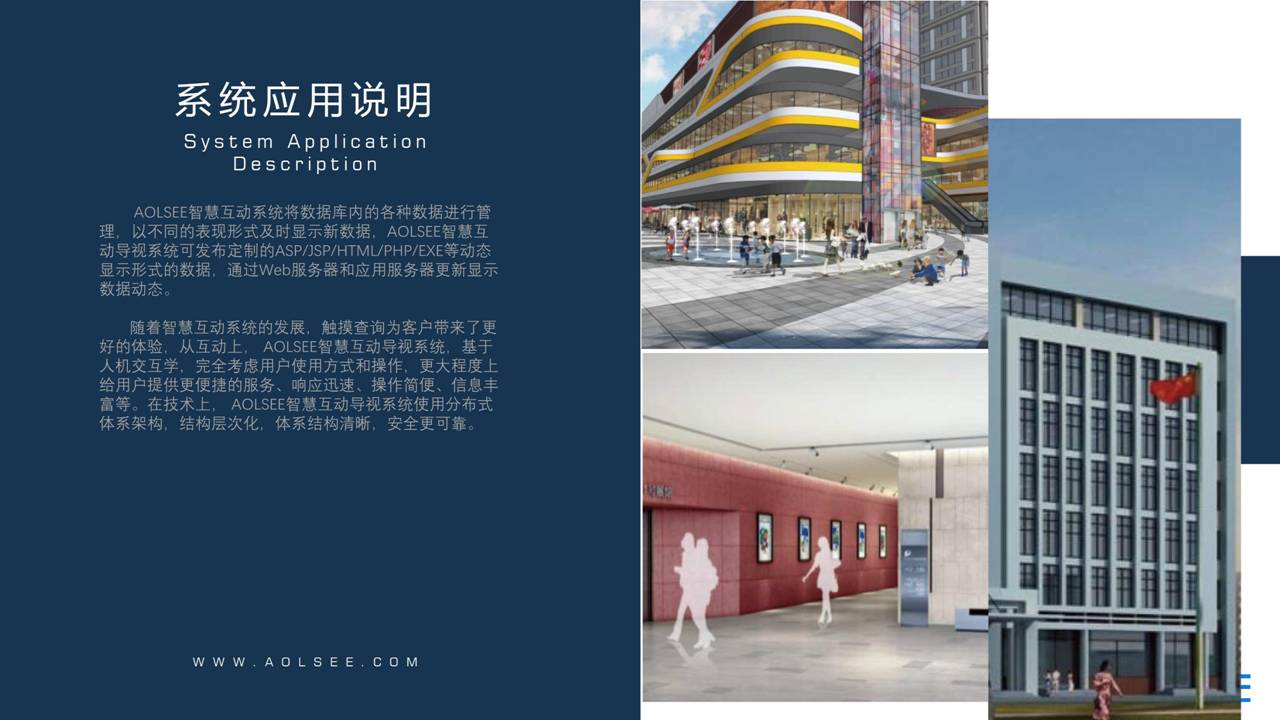 產(chǎn)品詳細(xì)介紹智慧互動(dòng)系統(tǒng)采用流行的B/S ,C/S架構(gòu)模式,更利于部署和維護(hù)。支持大屏幕觸摸橫版和豎版,集成了3D樓層引導(dǎo),宣傳,活動(dòng),查詢等為一體的功能。支持手勢(shì)滑動(dòng),支持手勢(shì)地圖放大,縮小,旋轉(zhuǎn)等功能。獨(dú)有的多樓層顯示,跨樓層3D路線引導(dǎo)及實(shí)時(shí)定位等獨(dú)特技術(shù)。 根據(jù)用戶需求定制開(kāi)發(fā),前端界面設(shè)計(jì)美觀大方,操作人性化,可點(diǎn)擊瀏覽單位介紹及服務(wù)設(shè)施的相關(guān)詳細(xì)文字、圖片、視頻等介紹信息;通過(guò)點(diǎn)擊系統(tǒng)上相應(yīng)的模塊,查看對(duì)應(yīng)的詳細(xì)信息;可展示宣傳視頻、圖片、文字等,無(wú)人點(diǎn)擊時(shí)屏保圖片自動(dòng)播放,提供播放圖片、視頻廣告功能; 功能 采用B/S架構(gòu)進(jìn)行終端和云平臺(tái)的連接,系統(tǒng)管理員可在后臺(tái)管理和更新前端內(nèi)容和素材; 包含信息發(fā)布功能:在無(wú)人觸摸的時(shí)候自動(dòng)循環(huán)播放視頻或者圖片,后臺(tái)可實(shí)時(shí)更新; 可根據(jù)客戶提供的素材和目錄結(jié)構(gòu)進(jìn)行定制,也可以采用系統(tǒng)自帶的標(biāo)準(zhǔn)模板進(jìn)行內(nèi)容更換; 可瀏覽周邊公共交通、銀行服務(wù)等信息; 支持通知通告、時(shí)間、天氣、PM2.5等實(shí)時(shí)信息; 強(qiáng)大的組織架構(gòu)管理、用戶管理、角色管理組成多種模式的權(quán)限管理; 可與其他第三方軟件對(duì)接,支持二次開(kāi)發(fā); 標(biāo)準(zhǔn)版頁(yè)面數(shù)不超過(guò)20頁(yè); 可支持3D地圖導(dǎo)引功能,地圖制作費(fèi)另算; 亮點(diǎn) 1.多樓層2D/3D地圖引導(dǎo)及實(shí)時(shí)定位功能 2.手機(jī)端掃碼,查看路線引導(dǎo) 3.廣告發(fā)布(圖片+視頻)并可統(tǒng)計(jì)播放次數(shù) 4.促銷活動(dòng)發(fā)布,過(guò)期活動(dòng)自動(dòng)過(guò)濾 5.會(huì)員服務(wù)(可對(duì)接會(huì)員系統(tǒng)) 6.周邊交通 7.活動(dòng)、廣告統(tǒng)計(jì) 8.電子雜志 9.互動(dòng)服務(wù) 10.定制界面,可以根據(jù)商場(chǎng)要求進(jìn)行界面UI定制 應(yīng)用場(chǎng)景 企事業(yè)、酒店、機(jī)場(chǎng)、車站、場(chǎng)館、學(xué)校、旅游景區(qū)。
