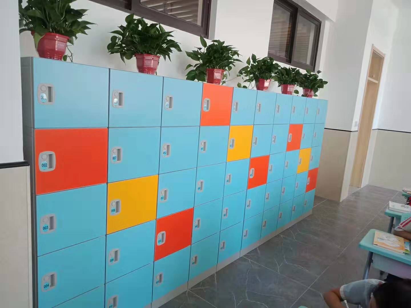 目前學生書包柜常規配置鎖具有密碼鎖、機械鎖、掛鎖、電子感應鎖等鎖具。方便使用和統一管理。常規配置門拉手一個,里面含有鎖舌和彈簧,防止柜門在靜態下自動彈開傷到小孩子。