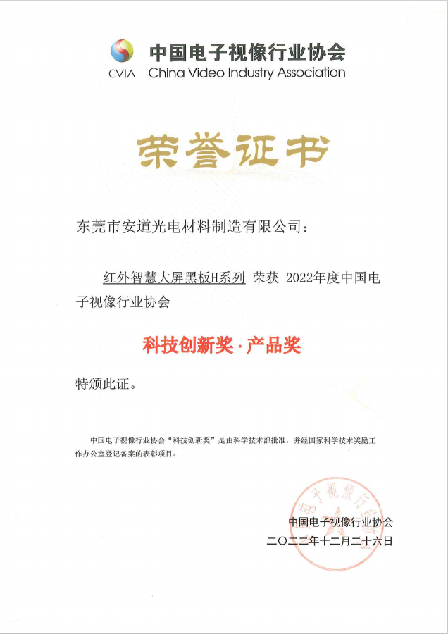 安道教育-紅外智慧黑板2022年度科技創(chuàng)新產(chǎn)品獎(jiǎng)(電子視像協(xié)會(huì))
