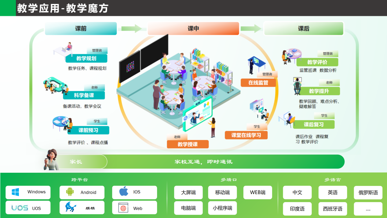 「安道教學魔方」構(gòu)建了完整的教學鏈條:課前支持預(yù)習資源推送與學生自主學習;課中結(jié)合智能終端(如智能交互平板、PC端、移動端)實現(xiàn)互動教學,提升課堂參與度;課后依托數(shù)據(jù)分析生成學情報告,輔助鞏固與測評,形成“因材施教"的動態(tài)反饋機制。當前,安道教學魔方深度融合國產(chǎn)化生態(tài)適配統(tǒng)信、麒麟等操作系統(tǒng),確保從Windows系統(tǒng)切換的無縫過渡,保障信息安全與用戶使用的流暢性。