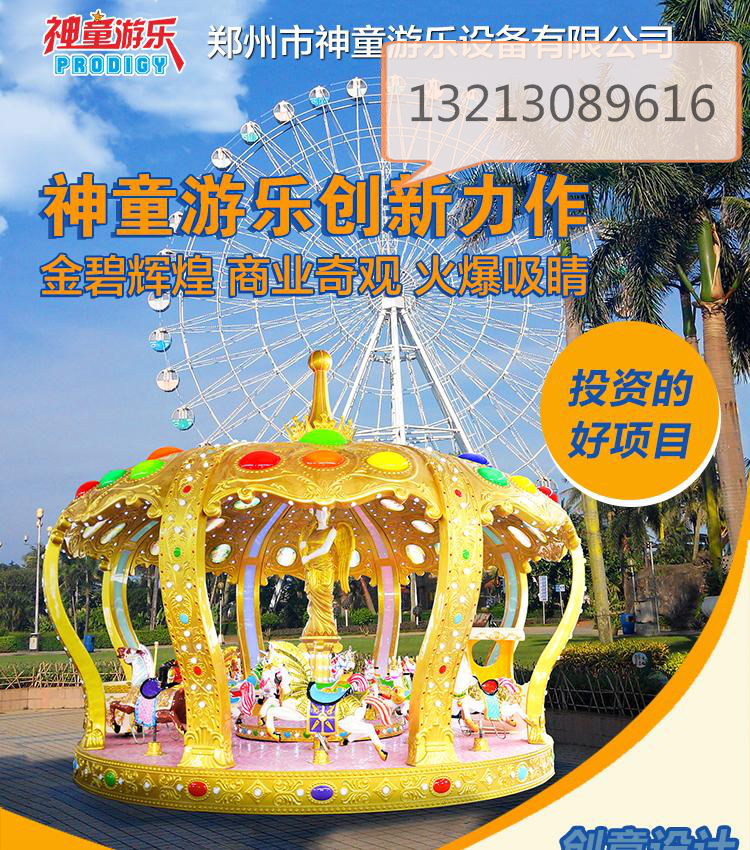 產品詳細介紹兒童大型游樂設備系列-皇冠戰馬獨特的造型,引領了轉馬游樂設備的新風尚!安全,耐用,有質感,炫燈閃耀,想不吸引眼球都不行!皇冠戰馬,造型緊跟時代潮流,一個神奇的皇冠,12匹歡騰的戰馬,一個夢幻月亮船,七彩斑斕的燈光帶領孩子們走進童話的世界! 豪華轉馬之所以受到客戶的喜愛,與它炫麗的外觀是完全離不開的。設備啟動后,當乘客坐在豪華轉馬里,七彩斑斕的鉆石燈光閃閃發光,金色銀色相互輝映,各種色彩的馬匹、王座競相奔跑,猶如萬馬奔騰的熱烈場面。皇冠戰馬頂內部有童話世界圖案燈光,與戰馬上的王子和公主形成搭配,溫馨舒適。 鄭州市神童游樂設備有限公司是中國游樂設備制造行業”摩天獎”獲得者企業,從事游樂設備的研發,設計,生產和銷售公司,公司成立了研發部,生產部,貿易部,售后服務部,主要生產銷售機械類游樂設備,充氣類加網PVC環保材料玩具,水上游藝設施,電子投幣類玩具,網紅游樂項目,無動力游樂設施,非標不銹鋼組合滑梯,淘氣堡,幼教設施;公司擁有專業的技術人員,專業的設計技能和專業的技術水平。本廠游樂游藝設施可以根據客戶要求定做,并享有保修服務,終身提供技術支持。 |