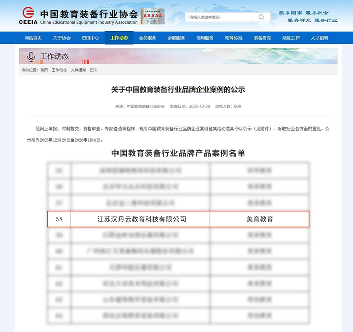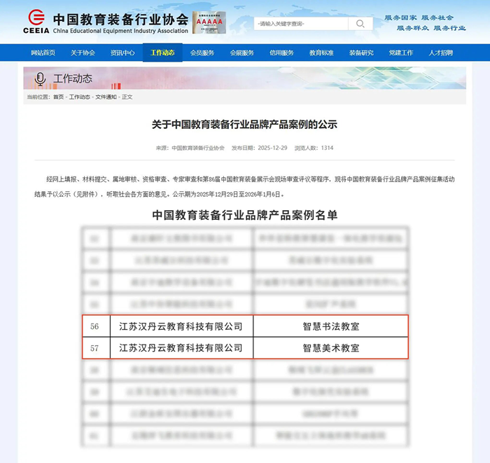 捷音似錦,經線上填報、材料提交、屬地審核、資格審查及專家遴選等多輪嚴格評審,中國教育裝備行業協會正式公布了“中國教育裝備行業品牌企業案例”及“中國教育裝備行業品牌產品案例”名單。江蘇漢丹云憑借卓越的綜合實力與創新成果,成功入選“中國教育裝備行業品牌企業案例”,旗下智慧書法教室、智慧美術教室雙品齊輝,同步斬獲“中國教育裝備行業品牌產品案例”權威認證,以藝教匠心賦能教育裝備新征程!