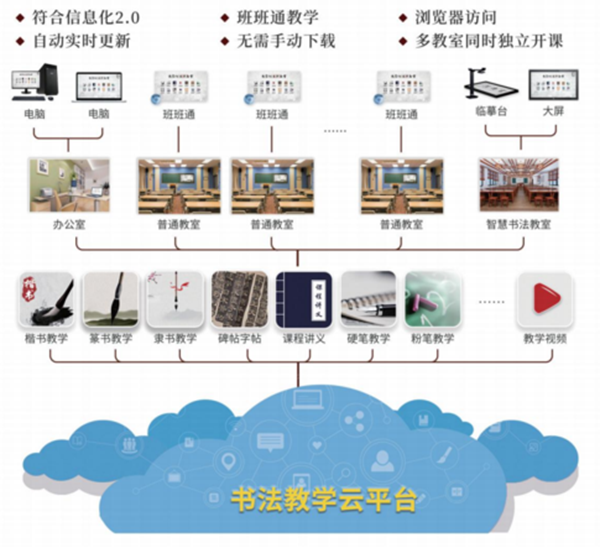 針對書法學科特點,基于智慧教室模型,提供書法教學工作中所需的三十余種子軟件系統。既有完善的授課系統,豐富的教學資源,還有便捷高效的輔助教學工具軟件,從課堂管理到筆洗控制系統,從備課系統到作業一鍵采集,從直播示范到互動視頻教學,滿足老師各方面需求的同時,支持開放式個性化服務。