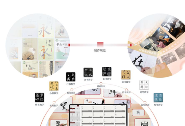 為落實雙減政策以及課后延時服務的需要,產品在覆蓋了教育部審定各套教材的基礎上,打造了豐富的書法課程體系,提供了多樣性的專業化書法課程,包括篆隸楷行草五體以及不同的軟硬筆課程,由書法特級教師、多位省級書法名師、全國暢銷字帖作者共同參與設計研發,專業化視頻團隊制作,覆蓋小學及中學,讓學校在開的了書法課的同時也能開的好書法課。課程視頻具有高清雙畫面示范教學內容,師生可以看清書寫畫面中的每一個細節,每一個特寫,結合國家一級播音員的配音,使得書法教學更加的專業嚴謹高效,確保書法教學的規范性與正確性。
