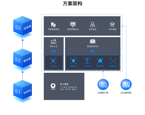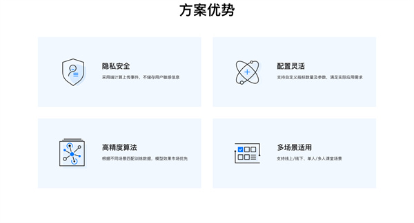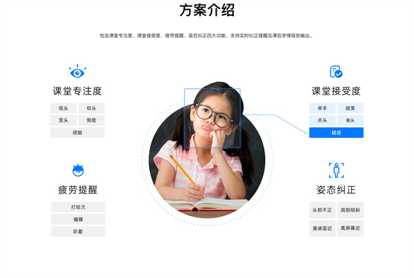 360在線教育AI學(xué)情分析解決方案包括課堂專注度、課堂接受度、疲勞提醒、坐姿糾正和視力保護(hù)5大解決方案,通過姿態(tài)識別、表情識別、距離檢測等維度分析學(xué)生行為,協(xié)助學(xué)生健康管理、為教學(xué)質(zhì)量評估提供數(shù)據(jù)支撐。