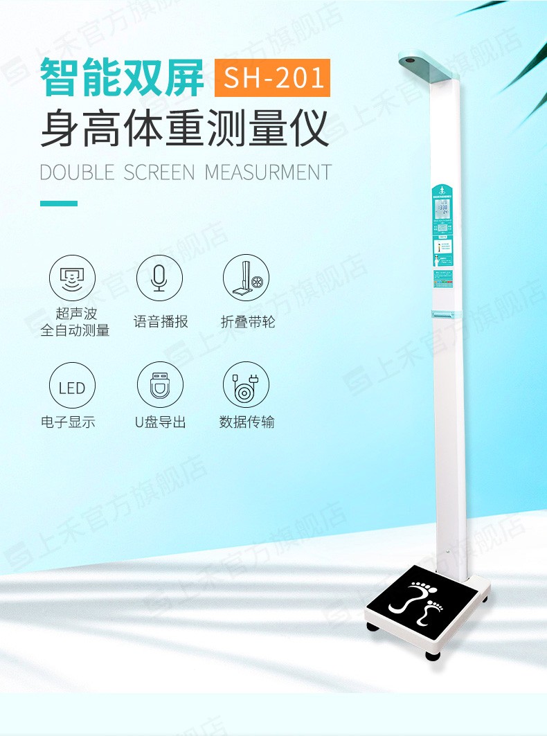 產品詳細介紹 參數:*超聲波無接觸測量身高、潔凈、衛生,測量速度快,測量精度高,外觀豪華上檔次; *數據輸出格式:提供RS232接口,并提供飲食健康建議,方便用戶關注體重對健康的影響; *自檢測功能:具有開機自檢功能,自動檢測身高和體重是否連接正常,如有異常并自動平判定異常原因; 體型:自動計算BMI指數,并判斷BMI指數范圍; 體重測量方式:精密平衡梁電阻應變式壓力傳感器稱重 身高測量方式:超聲波測量技術(采用高精度超聲波傳感器并實現溫度補償功能)。 *測高范圍:20-210cm, 鑒定精度:±0.5cm 分度值:0.5cm或0.1cm可調 *稱重范圍:2.0-500KG,鑒定精度:±0.1kg 分度值:0.1kg或0.01kg可調 測重傳感器:高精度度、高靈敏、高性能精密平衡梁式壓力傳感器; BMI:正常范圍19-24.9,采用最新的WHO標準或中國九城市標準,自動計算BMI數值; BMI精度:可根據客戶要求自由設置BMI精度0.1或0.01可調 *雙液晶屏顯示:*采用兩個高清液晶屏顯示: 5寸高清液晶屏待機狀態下顯示當前日期、時間和溫度,測量完畢后屏幕顯示身高、體重、BMI的測量結果以及體型偏胖、正常還是偏瘦。 3寸液晶屏上待機狀態下顯示用戶單位名稱(比如:某某省人民醫院)和歡迎語;測量狀態下顯示測量姿勢提示語,測量完畢后顯示理想體重、健康體重范圍以及飲食建議,另外還可以掃屏幕上的二維碼,測量結果直接發送到用戶手機上(選配)。 大字體超高清顯示,非常方便醫護人員查看測量結果 。 *自動語音播報:清晰語音報出測量數值并且客戶可以根據使用情況設置提示語音。 *數據輸出:提供RS232接口(標配),方便連接電腦;也可以支持藍牙模塊(此功能為選配) *測量速度:快速測量600次/小時。 機身可折疊:折疊后高度為1.2米方便運輸和移動 電源:采用AC100V-240V電源,輸入寬電壓適合電壓不穩定地區。 消耗功率:待機10W,工作時平均15W。 工作環境:溫度:-10℃至+40℃, 濕度:20%-85%PH。 推薦使用:醫院、社區服務站、疾控中心、體檢中心、養老中心,企事業單位等部門和單位;