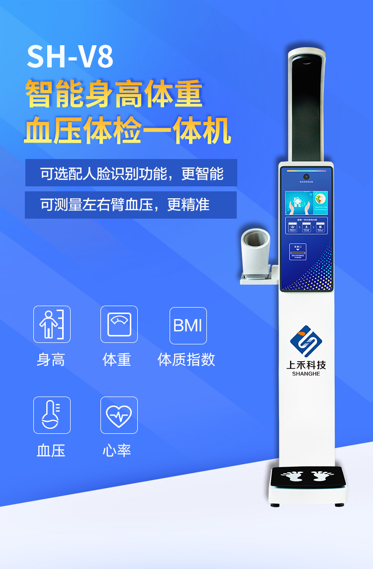 產(chǎn)品詳細(xì)介紹超聲波無接觸測量身高、潔凈、衛(wèi)生,測量速度快,測量精度高 操作系統(tǒng):采用專業(yè)為健康體檢深度定制安卓智4.4能最新OS操作系統(tǒng),可選擇單項(xiàng)測量,全部順序測量等模式,全程智能語音和動(dòng)畫提示操作簡單, 通訊方式:提供RS232接口和WiFi接口,藍(lán)牙(選配),3G/4G(選配)RJ45網(wǎng)口(選配)。 可與第三方系統(tǒng)數(shù)據(jù)通信;兼容與醫(yī)院、電子病例(EMR)、HIS健康體檢系統(tǒng)數(shù)據(jù)共享通信; 體重測量方式:精度、高靈敏、高性能精密平衡梁電阻應(yīng)變式壓力傳感器稱重 身高測量方式:采用美國進(jìn)口SensComp超聲波傳感器并實(shí)現(xiàn)溫度補(bǔ)償功能, 身高測量:20-210cm, 鑒定精度:±0.5cm 分度值:0.5cm或0.1cm可調(diào) 體重測量:2.0-500KG,鑒定精度:±0.1kg 分度值:0.1kg或0.01kg可調(diào) BMI體型:采用最新WHO標(biāo)準(zhǔn)或者中國九城市標(biāo)準(zhǔn)(客戶可根據(jù)自己需求進(jìn)行調(diào)成)自動(dòng)計(jì)算 血壓測量:1、方式:采用上臂式血壓計(jì)測量(支持左右血壓測量) 2、性能:智能加壓技術(shù)、示波測定法測量高壓、低壓、心率 3、范圍:血壓:0-299mmHg(0-39.9kpa) 脈搏:40-180times/min 4、精度:壓力:±3MmHg(±0.4kpa)內(nèi) 脈搏數(shù):±5% LCD顯示:采用10.2寸高清彩色液晶屏,超大字體,醒目清晰顯示,日期時(shí)間溫度,與網(wǎng)絡(luò)同步,時(shí)間準(zhǔn)確,顯示體型體型偏胖、正常、偏瘦。 打印功能:采用高速熱敏易裝打印機(jī)實(shí)現(xiàn)自動(dòng)打印自動(dòng)切紙,換紙方便,打印身高體重BMI,理想體重和體重正常范圍等多種信息,還可設(shè)置打印醫(yī)療衛(wèi)生單位名稱, 例如:某某疾病預(yù)防控制中心某某社區(qū)。 自動(dòng)語音播報(bào):清晰語音報(bào)出測量數(shù)值并且客戶可以根據(jù)使用情況設(shè)置提示語音 微信推廣:設(shè)備并提供測量數(shù)據(jù)和微信公眾號(hào)的綁定,居民在通過微信掃一掃手機(jī)獲取測量數(shù)據(jù)的同時(shí)關(guān)注醫(yī)療單位公眾號(hào),并提供健康建議,生成健康曲線方便用戶關(guān)注體重對(duì)健康的影響,方便醫(yī)療單位健康知識(shí)的宣傳和衛(wèi)生政策的傳達(dá)。 數(shù)據(jù)存儲(chǔ):可存儲(chǔ)100萬條以上測量數(shù)據(jù),并支持U盤導(dǎo)出, 多媒體廣告屏:采用10.2寸彩色高清液晶屏觸摸大屏,液晶屏上可以設(shè)置顯示使用單位名稱, 例如:某某疾病預(yù)防控制中心某某社區(qū)。自動(dòng)循環(huán)播放視頻音頻及圖片宣傳健康知識(shí)或衛(wèi)生醫(yī)療政策,使用單位可以自己更換宣傳片,非常方便。 電源電壓:采用AC100V-240V/12V直流電源,輸入寬電壓適合電壓不穩(wěn)定地區(qū) 消耗功率:待機(jī)15W,工作時(shí)平均25W 工作環(huán)境:溫度-10℃至+40℃ 濕度:20%-85%PH; 推薦使用:醫(yī)院、社區(qū)服務(wù)站、疾控中心、體檢中心、養(yǎng)老中心,企事業(yè)單位等部門和單位;