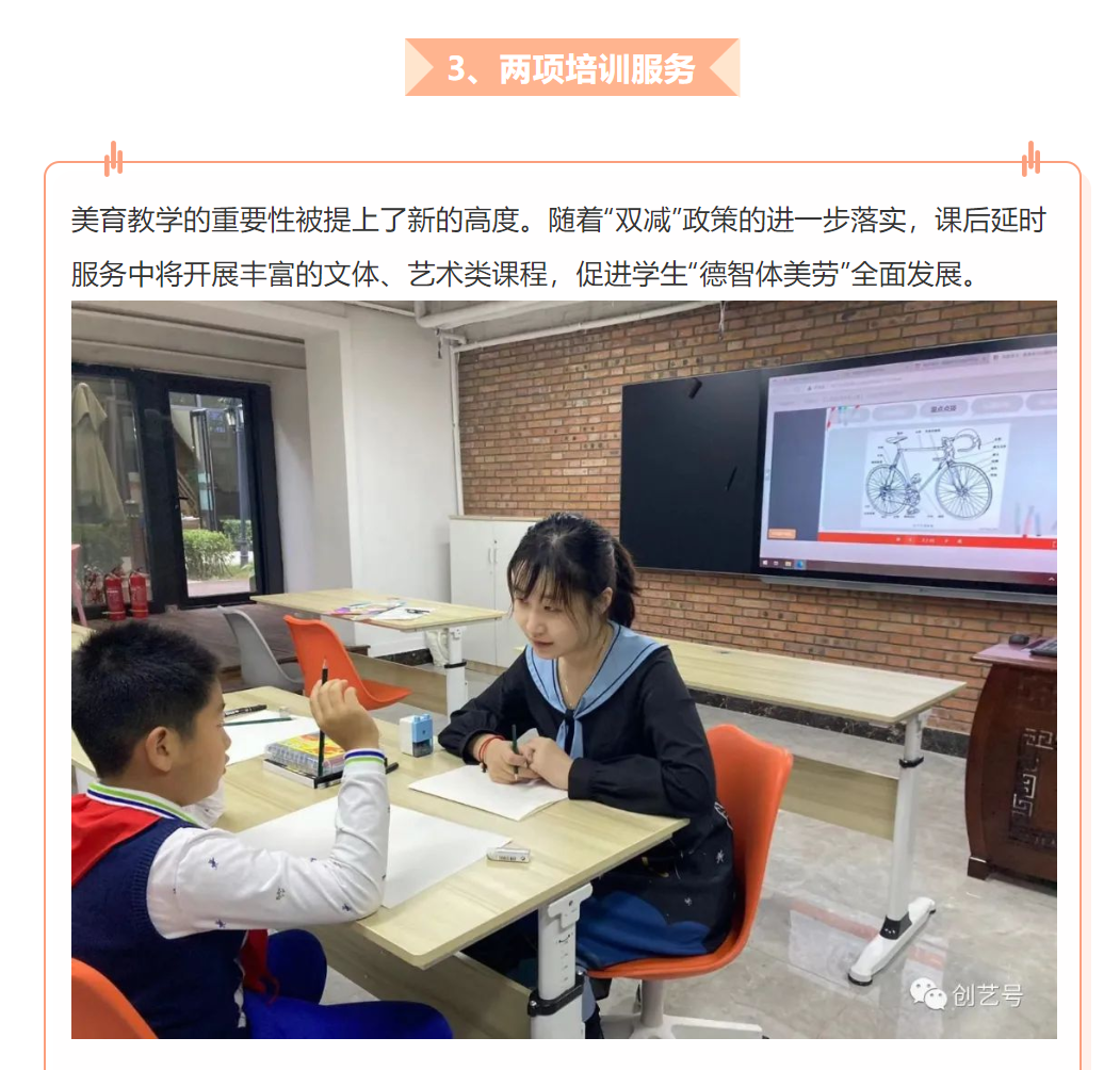 區域美育整體解決方案。創藝號美育綜合建設方案,做到“三建設,三提升”,建設美育創新型課程模式,提升區域整體教學能力;建設美育發展性評價體系,提升學生藝術綜合素養;建設美育專業化場地課程,提升學校優質特色發展,有效服務美育進校園、進中考。
