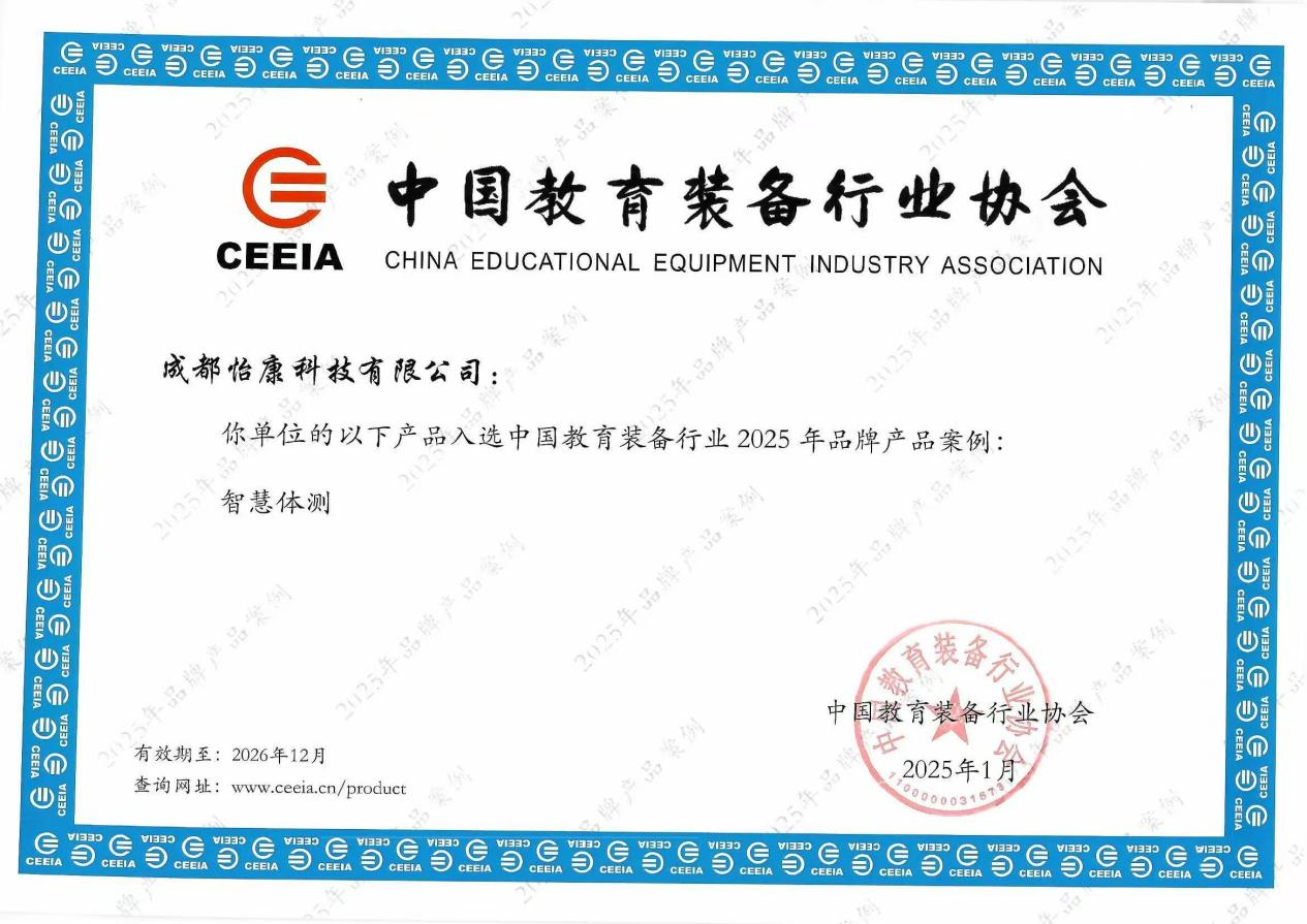 為培育一批具有較強競爭力的優秀產品,進一步提升教育裝備產品質量,中國教育裝備行業協會于2024年3月啟動了2025年品牌產品案例征集活動,并對企業報送的申報材料進行審核和指導。經網上填報、材料提交、屬地審核、資格審查、專家審查、第84屆中國教育裝備展示會現場審查評議和公示等程序,成都怡康科技有限公司自主研發的軟、硬件產品“智慧體測”成功入選中國教育裝備行業2025年品牌產品案例。