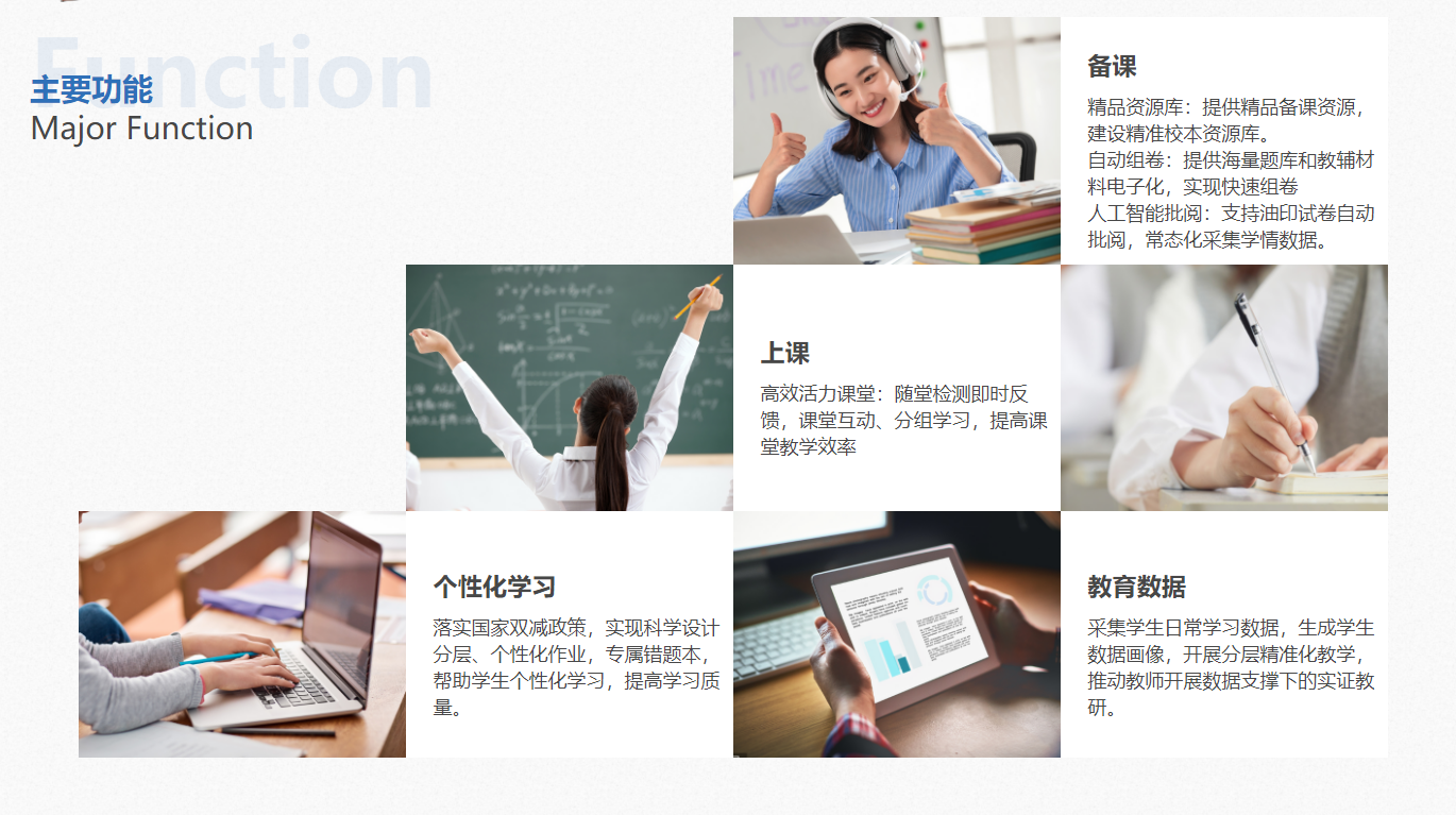 產品詳細介紹堅知果AI課堂,利用學校原有信息化基礎設備,不改變學校紙筆作答教學習慣,采用人工智能、大數據技術實現科學設計分層、個性化作業,課堂數據即時反饋,提高課堂教學效率,PAD智能終端設備無需進課堂,即可實現分層教學、精準化教學。采集學生日常學習數據,生成專屬錯題本、學生數據畫像,助力學生個性化學習。教研備課平臺為教師提供海量精品資源,推動教師開展數據支撐下的實證教研,為教育管理者教學改革、教育決策提供科學準確的數據支撐。 |