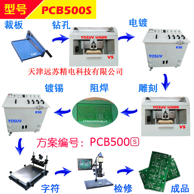 工藝目的: 裁板:將覆銅板通過精密裁板機裁成所需尺寸,一般比所需要尺寸多出來1CM邊框。 鉆孔:根據軟件提示,將PCB板上所有的孔通過雕刻機鉆出所需的孔。 孔金屬化:用過孔電鍍系統對PCB板上的孔進行金屬化處理。 雕刻:用PCB雕刻機對覆銅板進行雕刻,雕刻出所需的線路。 阻焊:用曝光機對雕刻好的PCB板進行曝光,將曝光好的PCB板進行綠油阻焊。 字符:用絲印機對做好阻焊的PCB板進行字符的絲印。 板面處理:將做好的線路板進行表面處理,便于焊接。 檢修:通過視頻檢測儀處理表面細微金屬碎屑,以便于達到最佳效果。 設備配置: (1)裁板機C60 產品概述: 遠蘇科技是國內頂級PCB雕刻機生產制造商,專注于國內外高端企業及學校客戶的精密研發制板需求,提供用于對覆銅板進行鉆孔、雕刻、外形銑割的線路板雕刻機及相關設備。 ________________________________________ 技術參數 最大切板尺寸 345mm 外形尺寸 480*330*180mm 重量 12kg ________________________________________ 產品亮點 • 特制鋼長壽命刀刃,耐用性強,獨特的省力杠桿式設計,輕松切割各種厚板材。 • 流線型的外觀符合人體工程學的設計。 • 配置水平對位功能,可以方便的切割固定形狀的PCB板。 • 最大切割長度345mm,最大切板厚度3mm。 • 具有對位和固定標尺,精度更高,使用更方便。 • 防誤傷安全裝置,固定透明保護罩,既保證不會誤傷手指,同時也可以清晰觀查切板過程及切板質量。 ________________________________________ 產品用途 C60高精度裁板機主要用于PCB制板工藝過程中線路板的裁切工藝,流線型的外觀設計,獨特的省力桿設計及防誤傷裝置,讓操作者能夠安全輕松的裁板。 (2) 過孔電鍍機K90 產品概述: 遠蘇科技是國內頂級PCB雕刻機生產制造商,專注于國內外高端企業及學校客戶的精密研發制板需求,提供用于對覆銅板進行鉆孔、雕刻、外形銑割的線路板雕刻機及相關設備。 ________________________________________ 技術參數 最大板面 300*300mm 最小孔徑 0.3mm 最大厚徑比 2.5:1 輸出電流 0-15A 工作電壓 220V/50HZ 外形尺寸 880mm(L)×600mm(W)×920mm(H) 重量 90kg ________________________________________ 產品亮點 • 電鍍液微循環系統:內置兩套微孔發泡管和靜音氣泵使電鍍液形成微循環,提高過孔電鍍的質量。 • 電鍍件往復運動功能:通過調速,可控制電鍍速度。 • 環保無污染:K90采用新型環保黑孔化直接電鍍工藝,安全、可靠、高效。黑孔液不含有傳統的化學鍍銅成分,取消甲醛和危害生態環境的化學物質在配方中的使用,屬于環保型產品。 • 操作便捷:產品槽體采用耐酸堿材料,恒溫裝置采用鈦加熱管,能自動恒溫,槽體工作時間、溫度可預設,操作簡易方便,自動化程度高,貫孔導通率100%。 • 一體化的設計:使整機結構緊湊。 • 密封式的設計:保證電鍍液不受污染,保證電鍍質量。 ________________________________________ 產品用途 K90過孔電鍍機,又稱孔化機,鍍銅機,在PCB物理快速制板工藝中主要用于對線路板上的孔進行金屬化處理。較常用于雙面板線路板的貫孔沉銅工藝。將完成鉆孔的覆銅板置于本機中,設置好相關參數,即可輕松快速的完成金屬孔化工藝,機器帶有加熱,鼓氣及電鍍功能。 (3)線路板雕刻機V5 產品概述: 遠蘇科技是國內頂級PCB雕刻機生產制造商,專注于國內外高端企業及學校客戶的精密研發制板需求,提供用于對覆銅板進行鉆孔、雕刻、外形銑割的線路板雕刻機及相關設備。 ________________________________________ 技術參數 加工范圍 雙面板/單面板 加工面積 305×305mm 最小加工線徑 3mil(0.075mm) 最小加工線距 5mil(0.127mm) 分辨率 0.03mil(0.75um) 工作速度 6m/min 主軸轉速 0~60000r/min,無級調速,軟件自動優化轉速 主軸功率 92W 直線導軌 進口直線導軌 傳動方式 進口滾珠絲桿 鉆孔孔徑 0.3~3.175MM 鉆孔深度 0.02-3.5mm 鉆孔速度 150(孔/min) 控制方式 電腦控制 通信方式 RS-232/USB 操作系統 Windons 98/2000/XP/Vista/7/10 最小內存配置 256MB 體積 750mm(L)×660mm(W)×660mm(H) 重量 110kg 消耗功率 250 W 電源 220V/50HZ 支持軟件 支持Protel99se、DXP、Altium Designer、Eagle、Pads、Proteus、CAD等常用EDA軟件(支持所有pcb及gerber格式的文件) ________________________________________ 產品亮點 自動原點定位:可以從任意位置自動回到設定的零點,擁有原點記憶功能。 雙面板自動定位技術:保證了定位的精確性與正確性。 斷點續雕:從任意百分比開始雕刻,或雕刻到某一百分比結束。 模擬運行:根據設定的參數,仿真顯示實際加工過程。 實時顯示加工路徑:加工前首先顯示所有加工路徑,在加工過程中實時顯示當前位置。 任意區域選擇雕刻:選擇任意區域,進行雕刻。 組合雕刻/自動選擇刀具:選擇兩把雕刻刀,自動分配雕刻區域。在不影響雕刻精度的情況下選擇一把大雕刻刀,快速銑掉大塊的空白區域。 萬能鉆孔:使用固定銑刀挖出任意孔,減少了換鉆頭的次數。 外形銑割:板子雕刻完成后進行外形銑割。 智能主軸轉速優化功能:根據刀具自動優化主軸轉速,從而提高雕刻精度。 強兼容性:兼容目前市面上所有EDA軟件。 操作簡單:簡單易學,只需20分鐘即可熟練上手操作。 自動關機:長時間無操作指令則自動關機,保護設備。 LED照明:方便運行過程中清晰的觀察pcb制板情況。 超限保護:當人為操作不當觸發X、Y、Z極限保護裝置時,機器自動暫停,按復位按鈕即可恢復運行。 ________________________________________ (4)PCB曝光機E60 產品