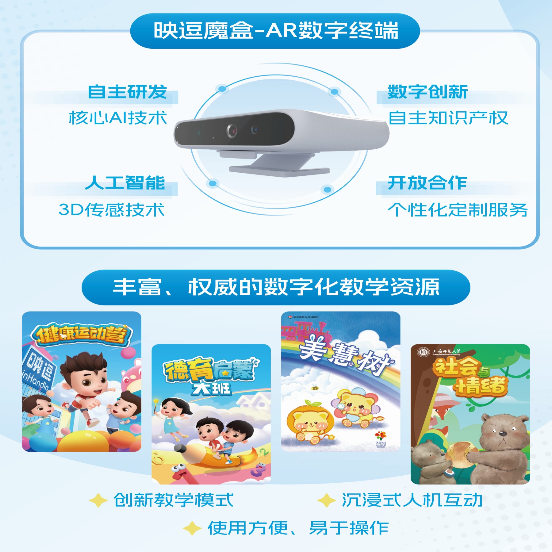 產品詳細介紹 映逗圍繞電視大屏,利用3D傳感技術,打造以3D體感攝像頭+機頂盒、3D體感一體機、AR互動桌面為硬件載體,包含手勢操作、千人千面等功能在內的多系列平臺解決方案,同時借助先進的云技術,將大量兒童體感認識教育、專業運動健康等內容匯聚到平臺上。通過平臺與內容的有機結合,讓所有視頻終端擁有體感交互能力,從而在教育、健康、監控監測、評價、家校互動等方面拓寬用戶電視的使用場景,提升用戶體驗,改變用戶對電視大屏的既有認知,從而達到重新定義智慧課堂的公司愿景。 映逗魔盒采用3D視覺識別技術,利用3D相機實現人臉識別、手勢識別、人體骨架識別、三維測量、環境感知等功能。配合實時多人姿態估算技術,實現實時的人體行為分析、AR教育、AR互動、游戲、體感健身等眾多應用場景。用“靈境”技術打造教育科技創新⼯具,助⼒教育數字化,發展數字化教育。 |