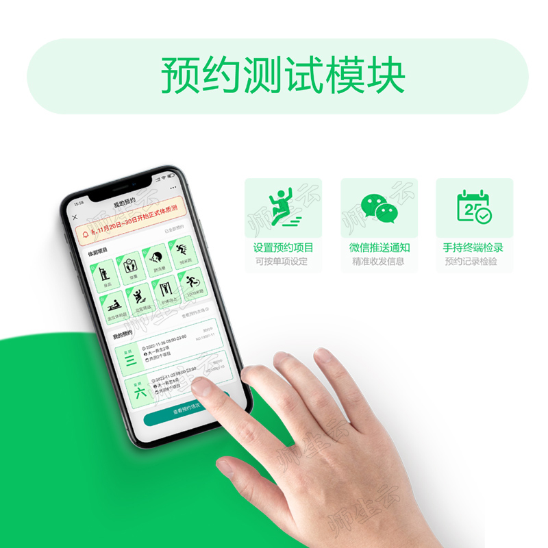 ①預約測試管理 預約參數設置 預約場次記錄管理(可按測試項目/院系班級/年級/性別等篩選) 每場次的學生管理 復制預約場次 場次延期設置 ②學生端預約 查看可預約的場次(申請/取消) 查看已預約的體測項目 已預約場次顯示個人信息 |
