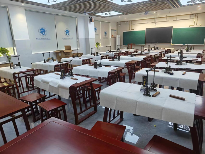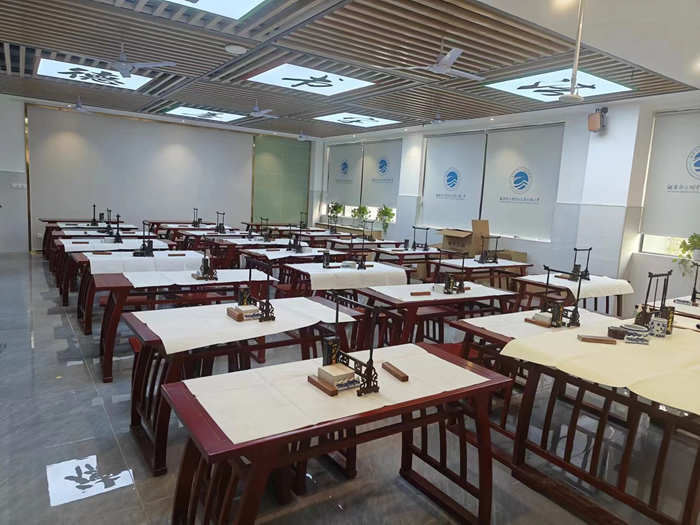 仿古實木書法桌、專業筆掛、硯臺池一應俱全;墻飾以國學經典字畫,配備了現代化的多媒體教學設備,方便老師示范運筆細節,實現傳統與現代的完美融合。
