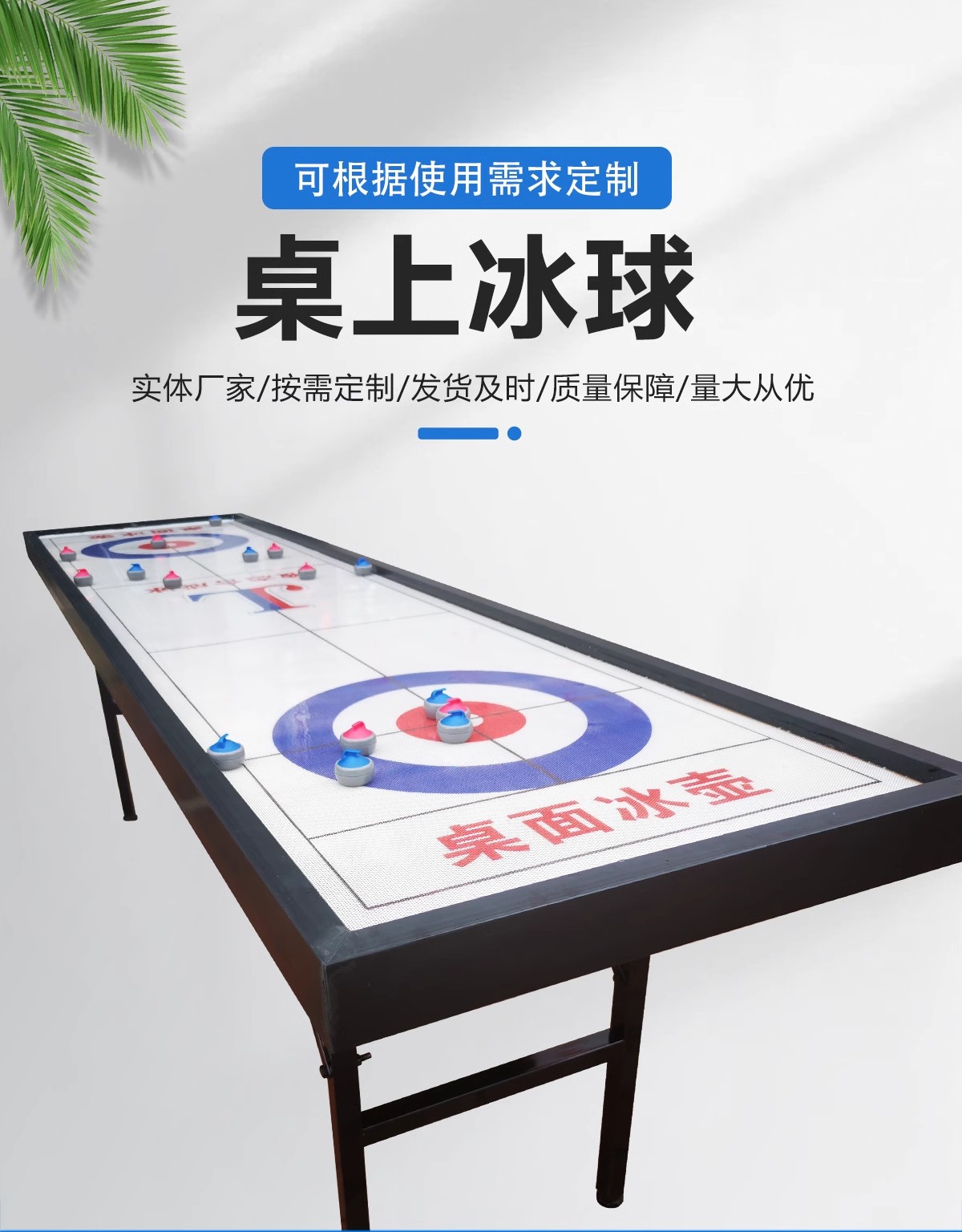 產品詳細介紹 1.標準球道尺寸:2350mmx530mm, 公差為土5mm。 2.配 16 個冰壺球,球由塑料外殼和鋼球組合而成,主體為扁球體。 球的頂部有一小把手,冰壺球的投影直徑為38mm土 2mm,冰壺球的整體高度為31mm土2mm,每個球的重量 為72g。 3.標準桌面尺寸:2450mm(長)x610mm(寬)x720公差為土5mm。 4.桌邊采用聚乙烯塑料包邊,包邊總厚度70mm公差2mm。 5.桌邊有20mm公差2mm防撞圍擋,防止冰壺落地。