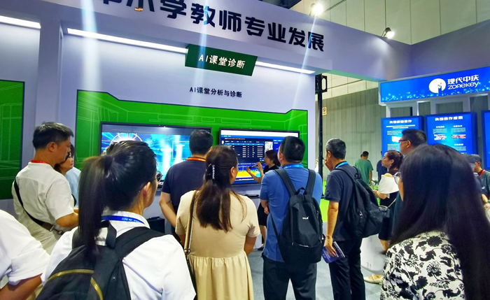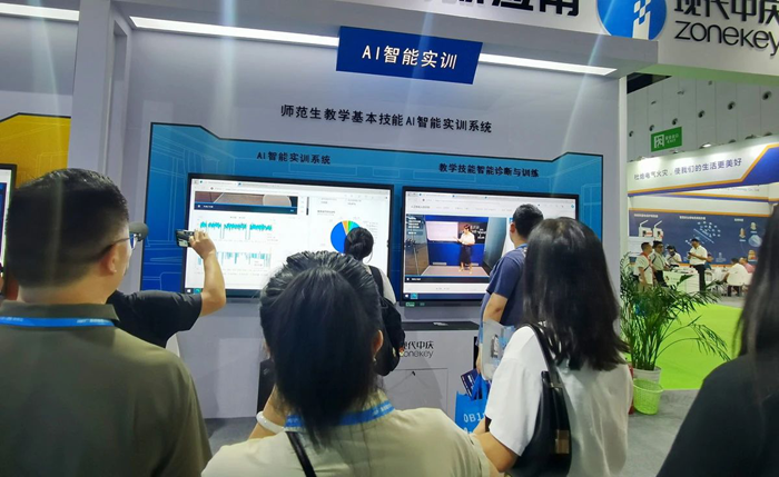 數字引航,人工智能時代,數字化是引領教育轉型升級的重要方式。現代中慶對數字化的理解已經由單點的試用上升到全面的數據應用普及,本屆展會中,現代中慶提出“讓AI走進每間教室”的口號,展示了基于全面數據的AI課堂診斷、AI精準教研、AI巡課督導、AI職初實訓等重磅AI應用。