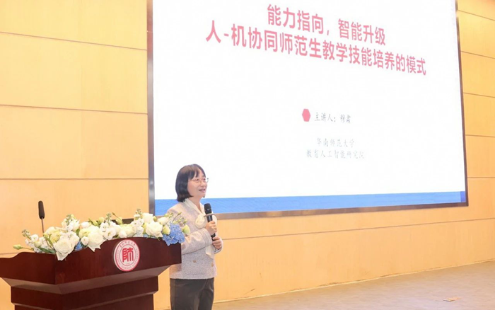 華南師范大學教育人工智能研究院副院長穆肅教授作為特約專家,做題為“能力指向,智能升級,人-機協同師范生教學技能培養的模式”的主題報告。