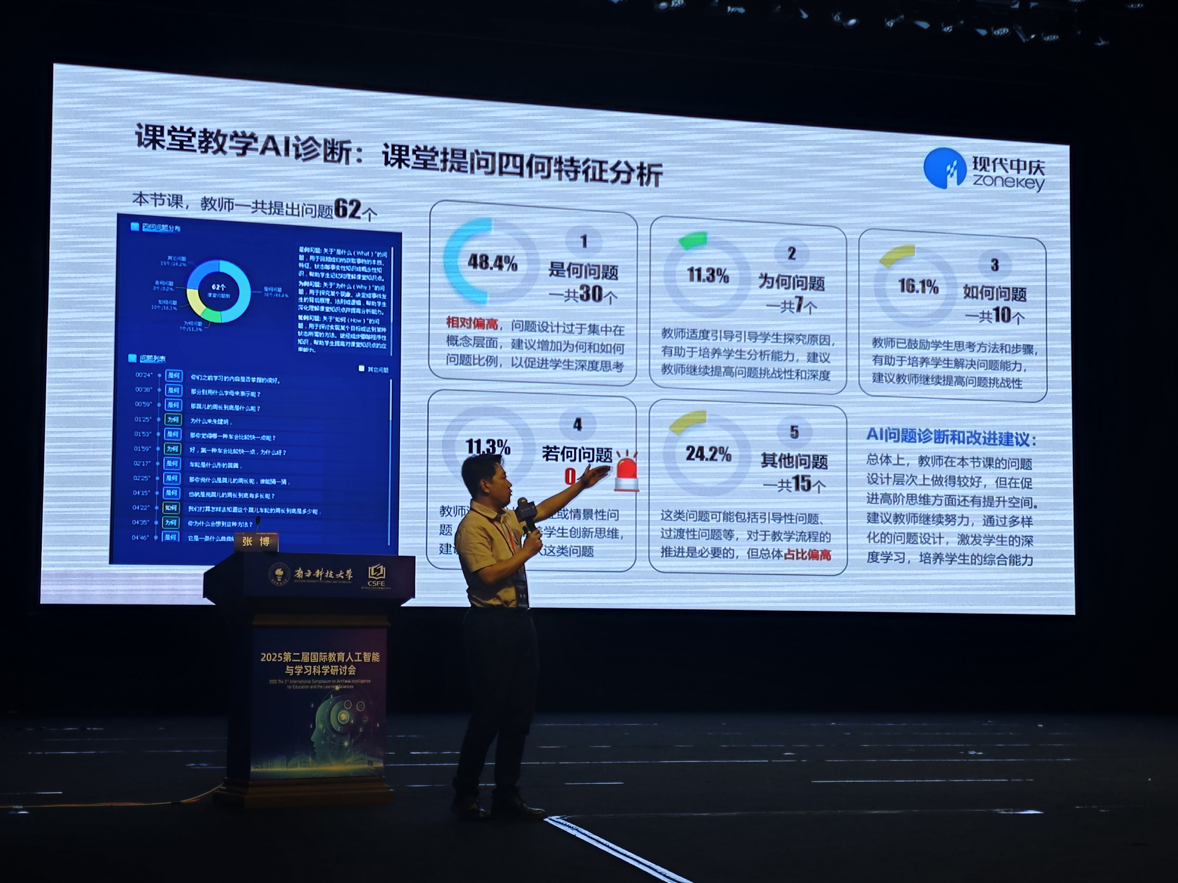 會議圍繞人工智能與學(xué)習(xí)科學(xué)融合發(fā)展的最新成果與未來趨勢展開深入交流,共同探討教育的重構(gòu)路徑與創(chuàng)新方向。在大會“數(shù)智科技前沿論壇”中,現(xiàn)代中慶張博做“基于AI數(shù)據(jù)的教師數(shù)字素養(yǎng)提升:從精準(zhǔn)診斷到專業(yè)成長的閉環(huán)路徑”報告,闡述了AI賦能下教研從經(jīng)驗主義向數(shù)據(jù)實證轉(zhuǎn)變的教師專業(yè)成長新范式。