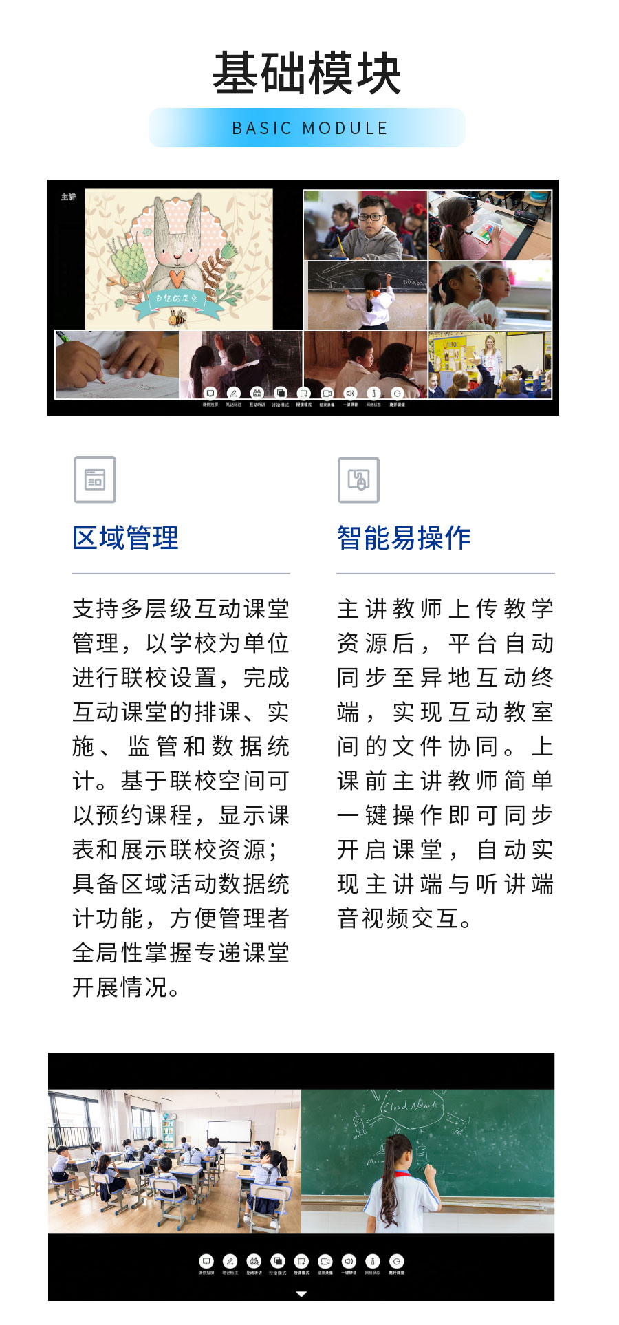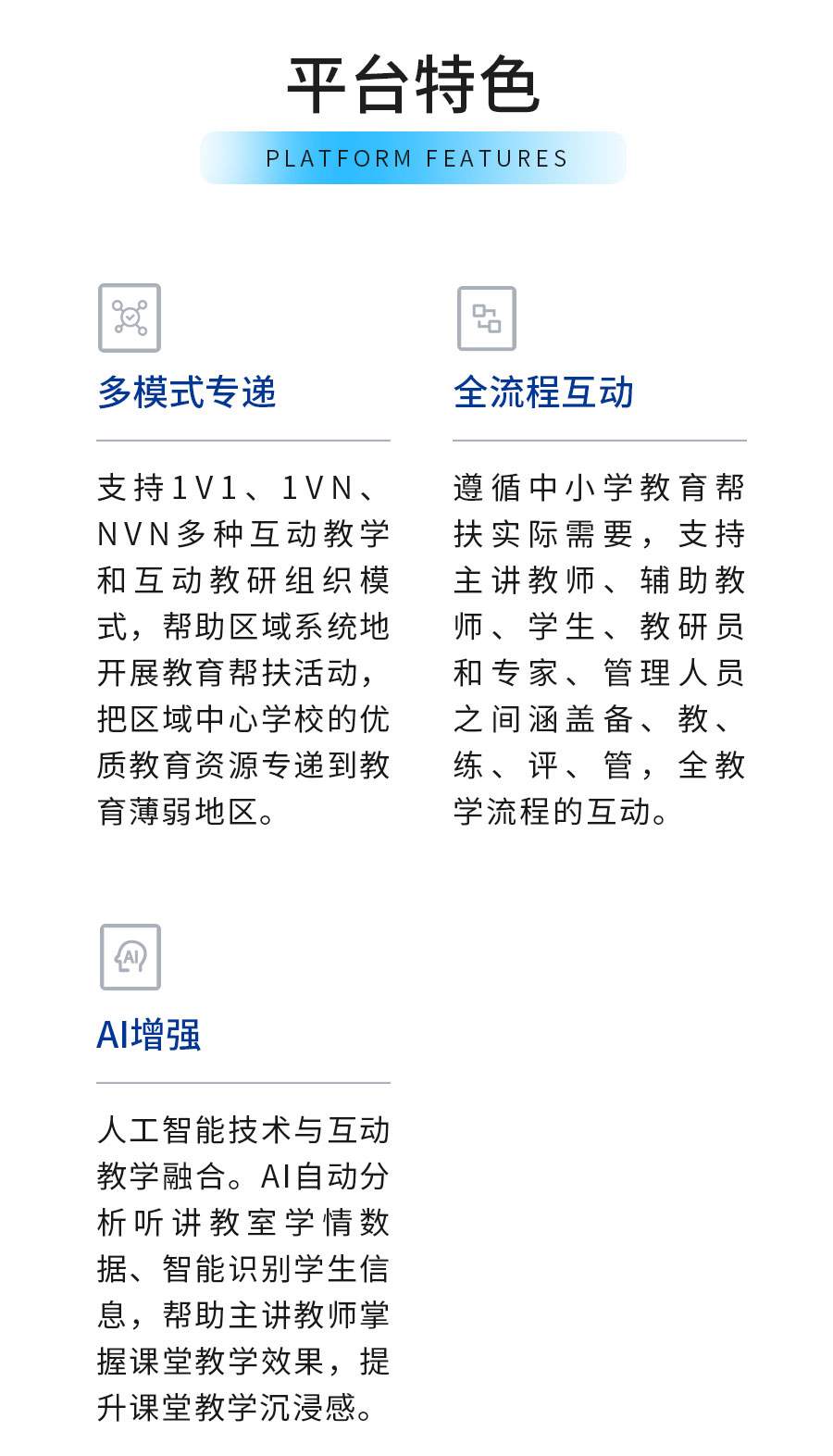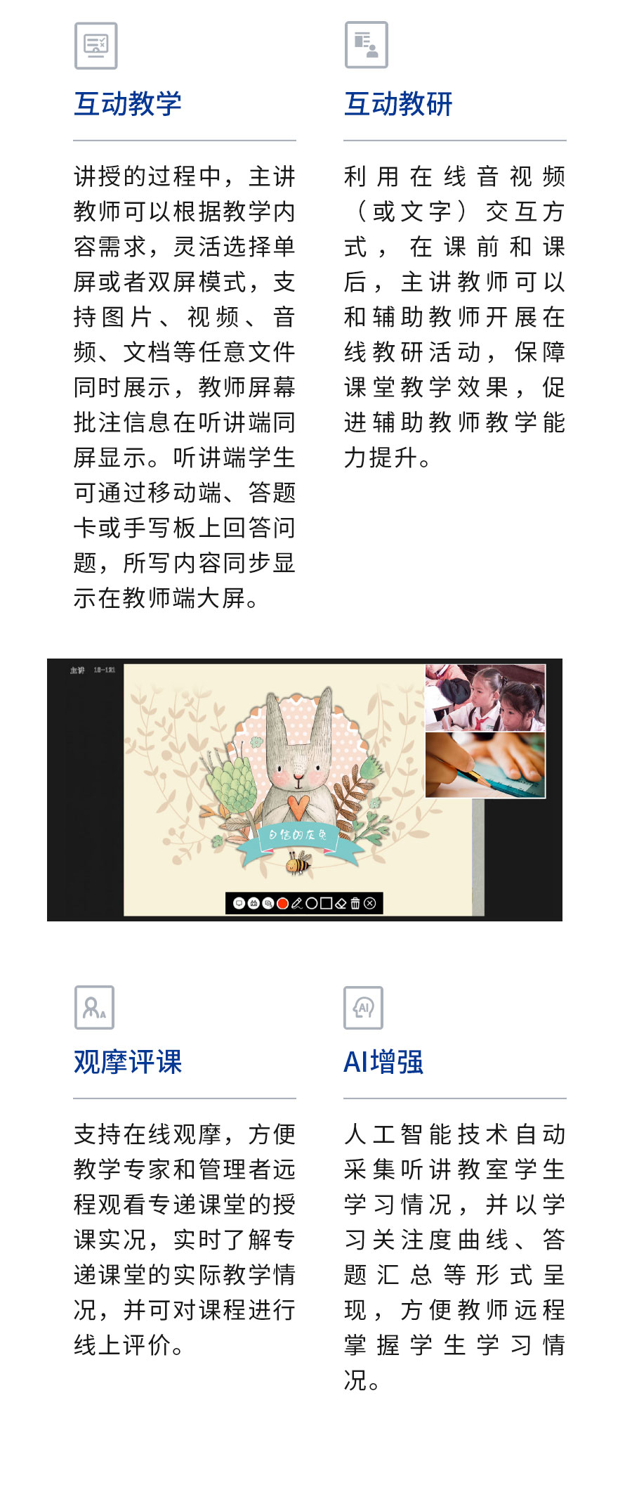 | AI教研應(yīng)用、錄播系統(tǒng)、智慧教室、“三個(gè)課堂”解決方案等 |