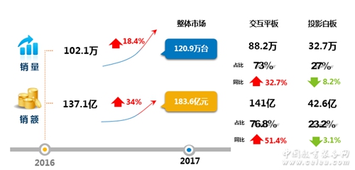 報(bào)告顯示,2017年度中國IWB市場銷量達(dá)120.9萬臺(tái),同比達(dá)到18.4%;銷售額實(shí)現(xiàn)183.6億元,同比增長34%。其中交互智能平板的同比較高,銷售額實(shí)現(xiàn)大幅增長,2017年交互智能平板銷售總額實(shí)現(xiàn)141億元,同比增長51.4%。