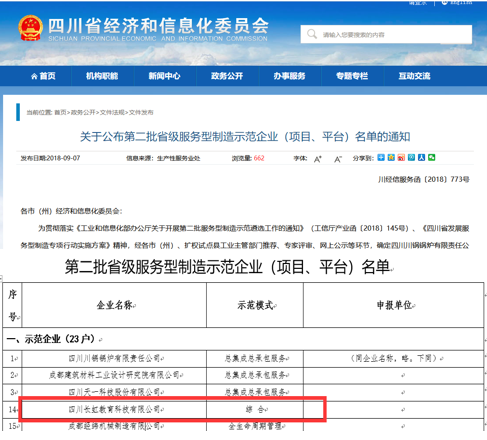 近日,四川省經濟和信息化委員會公布第二批省級服務型制造示范企業(項目、平臺)名單,四川長虹教育科技有限公司獲得“四川省服務型制造示范企業”殊榮,也是該批省級服務型制造示范企業中唯一一家綜合性示范模式的企業。