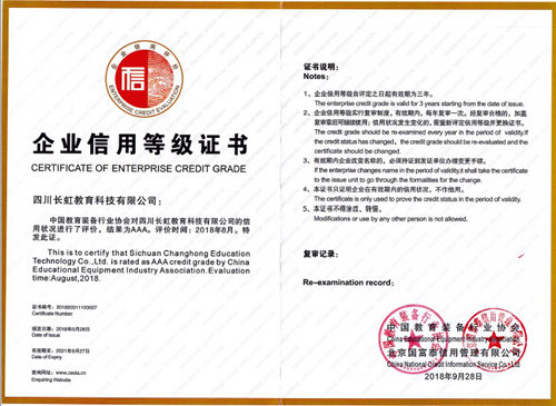 “全國質(zhì)量誠信標(biāo)桿典型企業(yè)”稱號,又獲悉,中國教裝備行業(yè)協(xié)會和信用評價工作委員會聯(lián)合發(fā)布了“關(guān)于公布2018年中國教育裝備行業(yè)協(xié)會企業(yè)信用等級評價結(jié)果的通知”(教信評文【2018】4號文件),長虹教育憑借誠信經(jīng)營和規(guī)范管理,從多家參評企業(yè)中脫穎而出,榮膺全國教育裝備行業(yè)“AAA級信用企業(yè)”稱號。