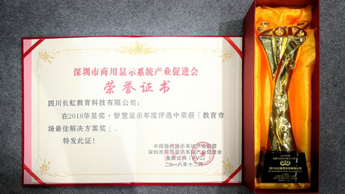 12月5日,由中國商用顯示系統產業促進會、深圳市商用顯示系統產業促進會主辦的第十屆中國(國際)商用顯示系統產業領袖峰會暨2018深圳(國際)智慧顯示系統產業應用博覽會在深圳會展中心8號館盛大舉行。長虹教育作為教育市場的杰出企業代表受邀出席,并憑借出色的產品方案和市場地位,繼續斬獲“2018年度教育市場最佳解決方案獎”。